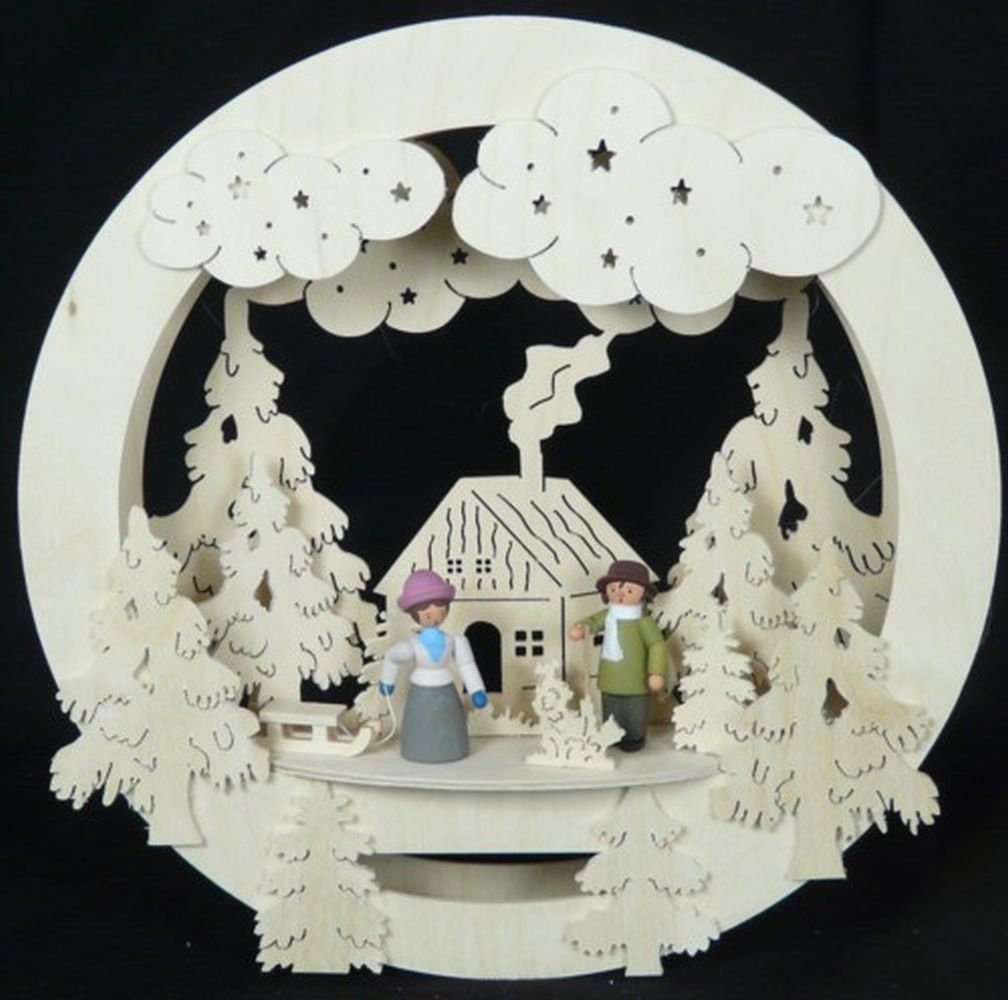 Fensterbild mit Haus Winterfiguren und Beleuchtung Dieses schöne Bild ist der perfekte Schmuck für Ihre Fenster. Holen Sie sich etwas besonderes mit diesem Fensterbild das in verschiedenen Arbeitsschritten komplett im Erzgebirge gefertigt wird. Es zeigt eine Silhouette mit einem Haus und davor steht Winterfiguren mit einem Schlitten. Das Bild hat eine Размер von 32 x 32 cm besitzt eine Innenbeleuchtung mit 220V und ist aus hellem Holz in Laubsäge-Optik gestaltet BxHxT 32x32x4cm NEU |