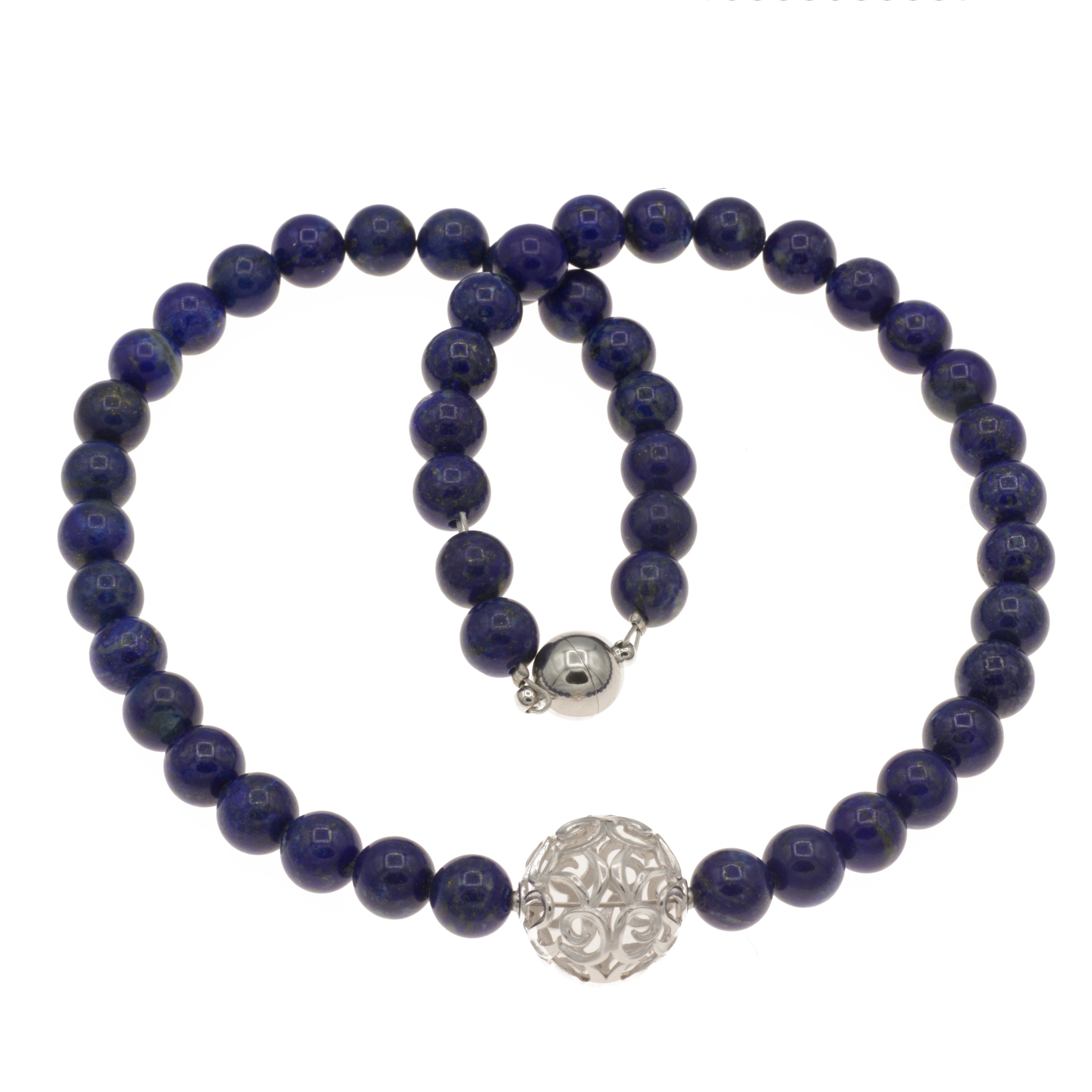 Lapislazuli ist ein natürlicher Stein der nur selten in tief blauer Farbe vorkommt. Einfache Qualitäten sind blau grau und deshalb meist gefärbt. Unsere Steine sind ungefärbt und von besonders guter Edelstein Qualität. Die Kette wird von uns vor Ort in Berlin nur mit besten Perlen gefertigt. Durchmesser der Perlen 8 mm. Mit einem Edelstahl Magnetverschluss. Mit einer 1,8 cm großen Perle aus 925 Silber anlaufgeschützt.