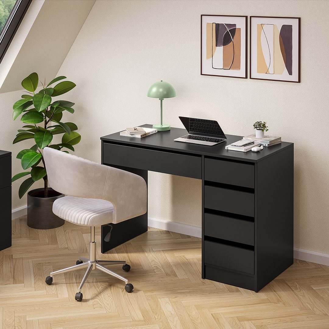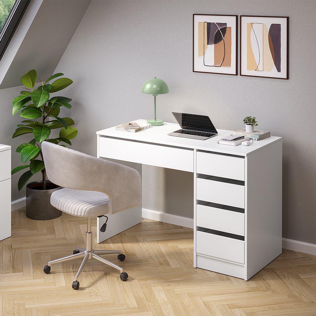Der Schreibtisch stellt eine geräumige Arbeitsfläche zur Verfügung, die ausreichend Platz für Laptop, Schreibutensilien und Notizbücher bietet. Unter der Tischplatte befindet sich eine große Schublade für häufig genutztes Material. Zusätzlich sorgen vier kleinere Schubladen an der Seite für noch mehr Ordnung – sie lassen sich je nach Bedarf rechts oder links montieren. Все Schubladen sind mit hochwertigen Rollenschienen ausgestattet, was eine besonders angenehme Nutzung ermöglicht.
