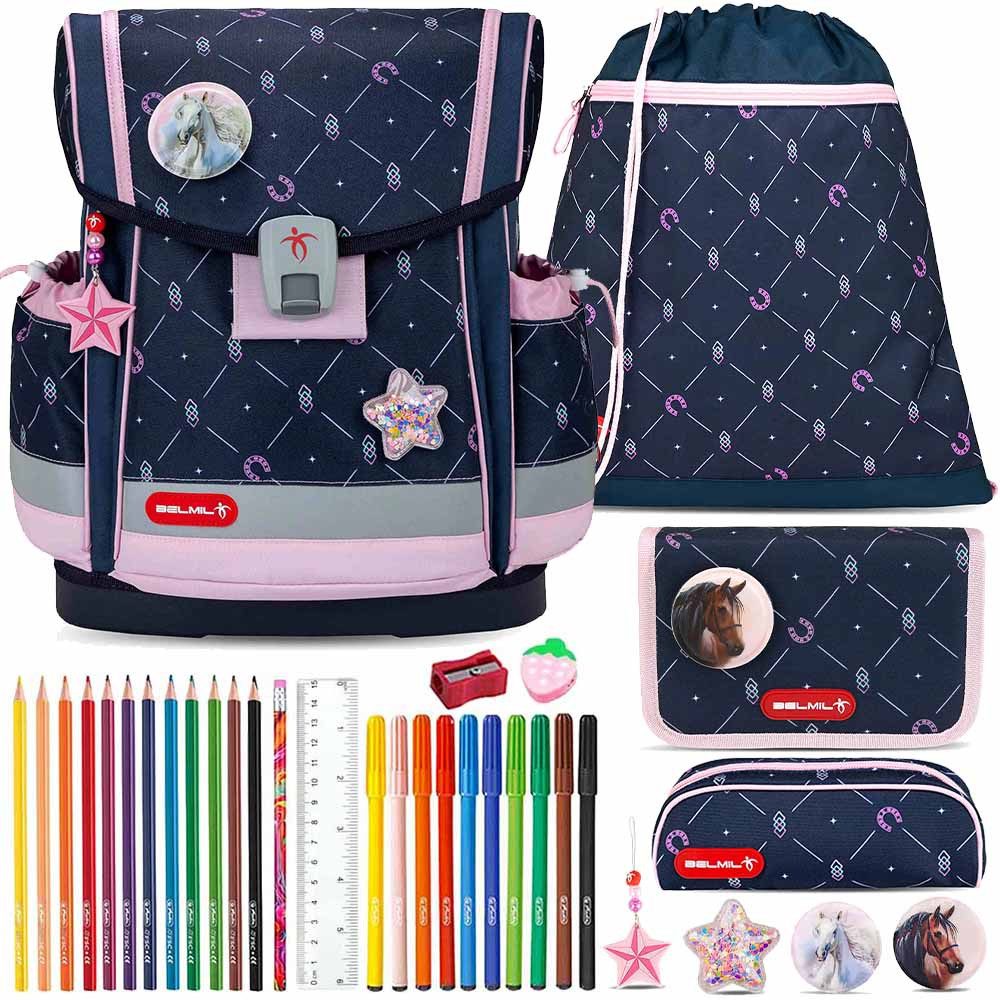 ACHTUNG! Bei diesem Belmil Schulranzen Classy Plus Midnight Gallop handelt es sich um ein Qualitätsprodukt, welches nach den neuesten Erkenntnissen des Gesundheits- und des Umweltschutzes erstellt worden ist. Das Bild zum gefüllten Schüleretui zeigt nur ein Beispiel, wie die Füllung aussehen kann. Je nach Verfügbarkeit, zum Zeitpunkt der Lieferung, kann der dargestellte Inhalt von der tatsächlichen Lieferung minimal abweichen. Bitte beachten Sie, dass die Farben auf Ihrem Bildschirm von den Originalfarben abweichen können.