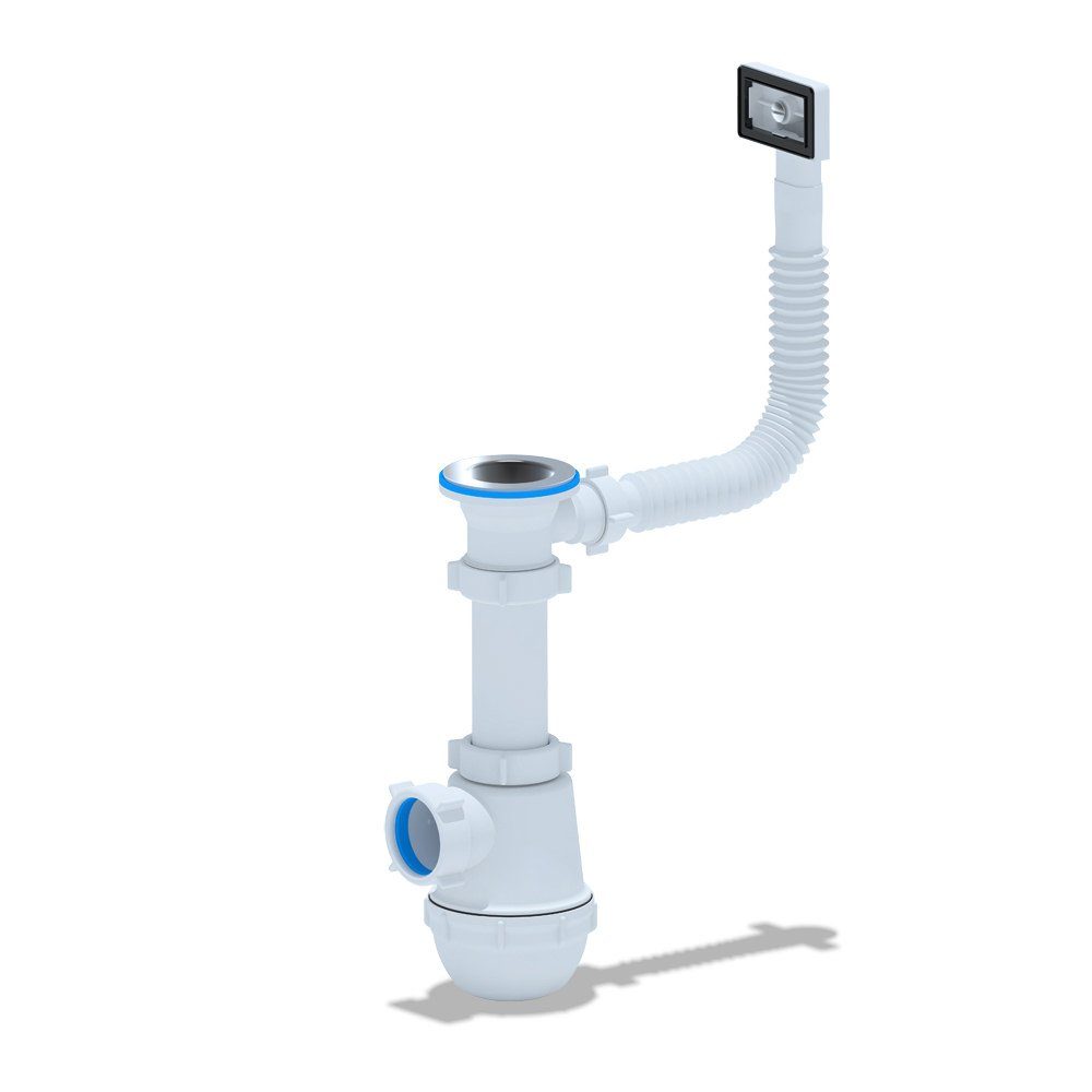 Mit diesem Flaschensiphon lässt sich das Waschbecken an das Abflusssystem anschließen. Hergestellt aus hochwertiger Kunststoffverarbeitung und mit verstellbarer Gesamthöhe wird er mit integriertem Geruchsverschluss geliefert, der bei korrekter Installation unangenehme Gerüche fernhalten kann. Das Sperrwasser im Siphon verhindert dabei, dass Luft aus den Abwasserrohren aufsteigt und sorgt dabei gleichzeitig für einen Ablauf des Brauchwassers. Um den Siphon zu reinigen, kann man den Boden leicht abschrauben und im Nachhinein wieder montieren. Es besitzt einen Überlauf mit einem Flexrohr mit Maximallänge von 580 mm, welches am Siphon befestigt werden kann. Mit dem Abgangsrohr lässt sich der Siphon mit dem Wandanschluss/den Abwasserleitungen verbinden. Der Waschtischanschluss beträgt 1 1/2“ und der Wandanschluss des Abgangsohrs Ø 40mm.