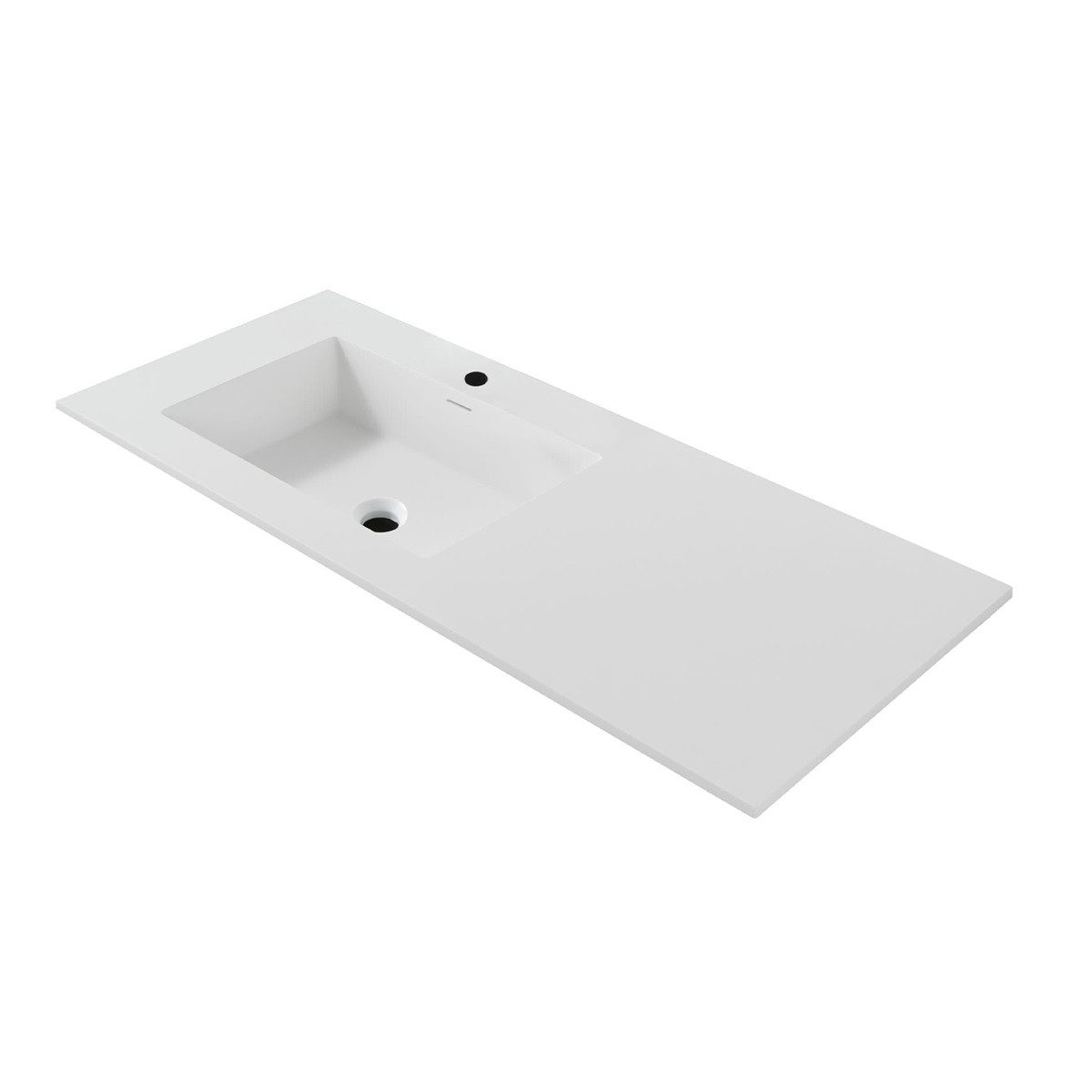 Dieser Waschtisch mit integrierter Waschtischplatte in edlem Mattweiß überzeugt mit geradlinigem Design, funktionaler Ausstattung und moderner Materialqualität. Mit einer Breite von 120 cm bietet er großzügige Nutzfläche, ideal für stilvolle Einzelbäder. Das Becken ist links positioniert, wodurch auf der rechten Seite eine praktische Ablagefläche entsteht.