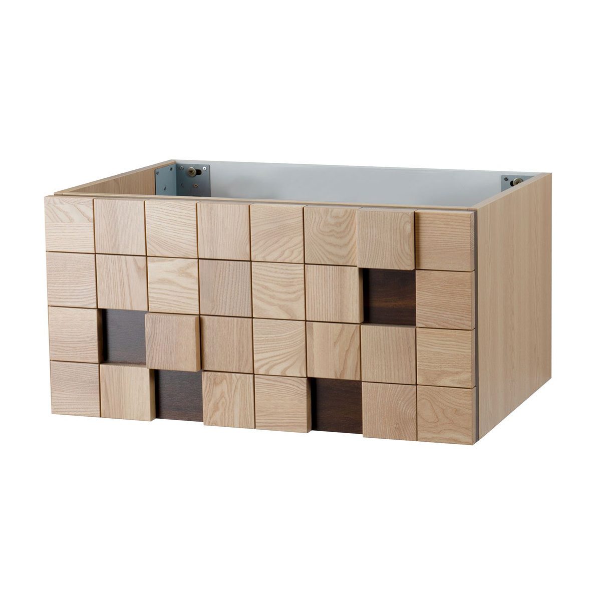 Die Front in heller Eiche auf Multiplex mit feinem Eschenfurnier strahlt natürliche Eleganz aus. Die grifflos gestaltete Schublade schafft ein ruhiges, reduziertes Erscheinungsbild. Dank des stilvollen dreidimensionalen Blockmusters wird der Eindruck noch verstärkt. Im Inneren sorgt eine durchdachte Schubladenaufteilung für Ordnung, während die hochwertige Hettich Führung mit Softclose Technik leises und angenehmes Спрятать garantiert. Eine integrierte Siphonaussparung macht das Möbel funktional vollständig für die Waschtischnutzung.
