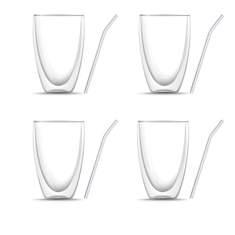 8-er Set: Vier Doppelwandige Latte Macchiato Gläser (ohne Griff, je 440 ml) & vier wiederverwendbare Strohhalme aus Borosilikatglas GRATIS