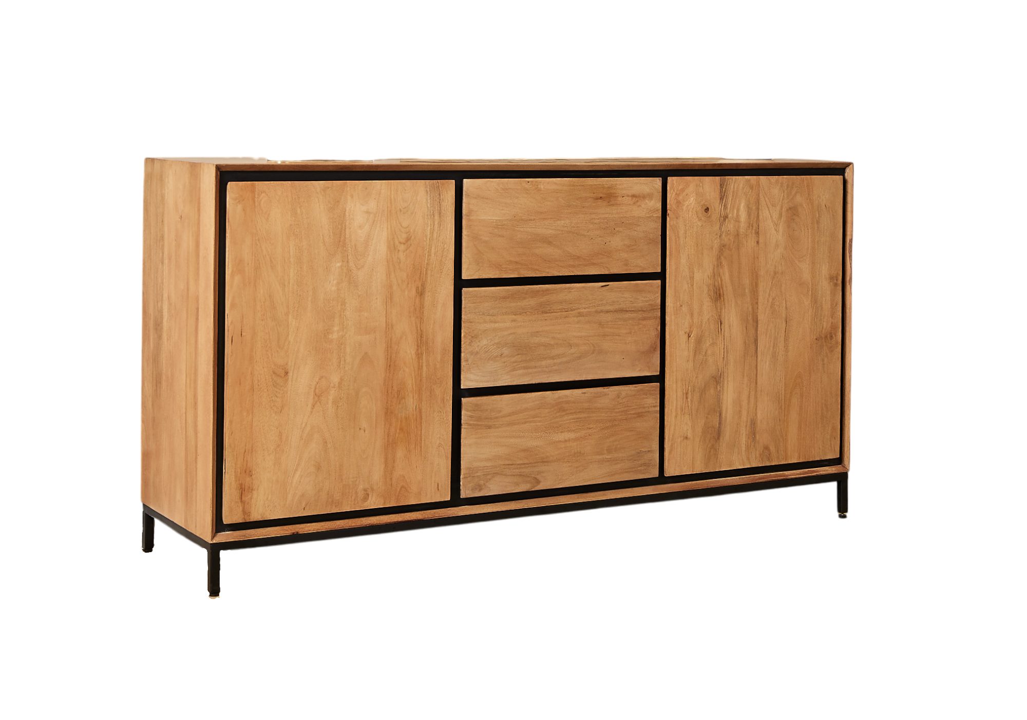 Das Sideboard Rois kombiniert lackiertes Mangoholz mit einem stabilen schwarzen Metallrahmen und wird so zum stilvollen Blickfang in Ihrem Zuhause. Die Komposition aus verschiedenen Holzelementen verleiht dem Möbelstück seinen zeitgenössischen Charakter. Mit zwei grifflosen Türen und drei Schubladen bietet das Sideboard reichlich Stauraum für Geschirr, Gläser oder persönliche Gegenstände.