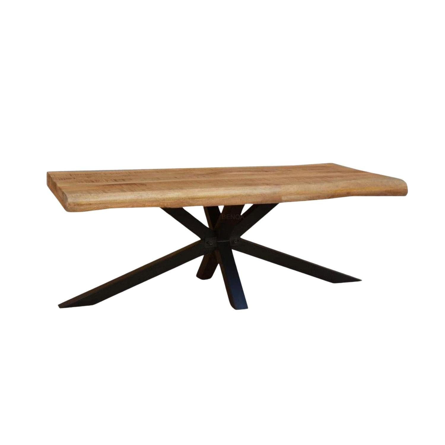 Couchtisch Live Edge – Natur pur trifft auf modernes Design Der Couchtisch Live Edge bringt rustikalen Charme und modernes Industriedesign perfekt in Einklang. Die Tischplatte besteht aus massivem Mangoholz in der Farbe Natur und begeistert mit einer einzigartigen Live Edge Kante, die die natürliche Form des Holzes bewahrt. Jeder Tisch ist dadurch ein echtes Unikat mit individuellem Charakter. Getragen wird die Platte von schwarzen Spinnenfüßen aus Metall, die nicht nur für Stabilität sorgen, sondern dem Tisch auch eine moderne, markante Optik verleihen. Ob im Wohnzimmer als stilvoller Mittelpunkt oder als Statement-Piece im Loft – der Live Edge Couchtisch überzeugt mit Funktionalität und Design. Produktdetails: * Breite: 130 cm * Tiefe: 80 cm * Höhe: 45 cm * Gewicht: 41 Kg