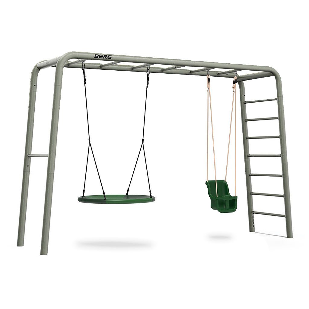 Die BERG PlayBase überzeugt durch ihren starken und robusten Rahmen, der absolute Stabilität garantiert. Der gesamte Rahmen zeichnet sich durch eine patentierte Rohrverbindung aus und dieser wird unterirdisch verankert, sodass die BERG PlayBase absolut sicher in Position steht und daher nicht einbetoniert werden muss. Die Maße hier bei der Medium Варианты sind 285 cm lang, 100 cm tief und 245 cm hoch. für die Seiten kann man zwischen einer Reckstange, einer Leiter oder einer Kombination aus beidem wählen. Eine genial durchdachte Konstruktion für die vielen Accessoires und ein sicheres und langanhaltendes Spielvergnügen.