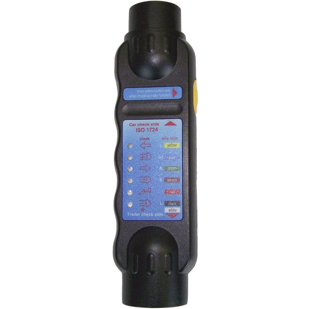 Dieses LED-Prüfgerät testet alle verkehrswichtigen Beleuchtungsfunktionen an Fahrzeug-Anhängerdosen und -Anhängersteckern. Die Anzeige der LED zeigt die jeweilige defekte Kabelfarbe. Es prüft alle 7poligen Dosen und Stecker und über die zwei mitgelieferten Adapter alle 13poligen Dosen und Stecker in 7poliger Funktion. Beide Adapter können zusätzlich zwischen 13poligem Zugfahrzeug und 7poligem Anhänger und umgekehrt verwendet werden. Stromaufnahme über 9 V Blockbatterie (bitte separat bestellen)
