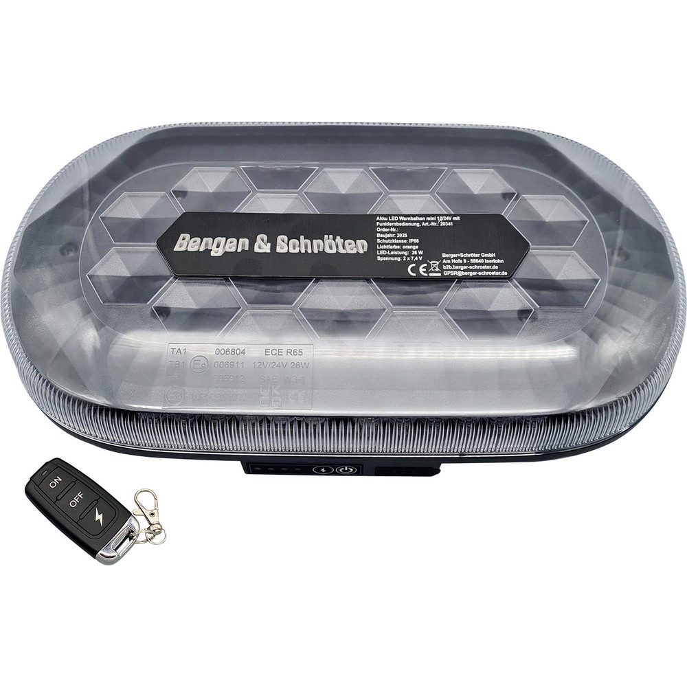 Betrieb über eingebauten Akku (4000 mAh, 2x7,4 V, 29,6 Wh), Homologation ECE R65, ECE R10, 48 superhelle LED´s (26 W), 980 Lumen, 2 Stck. gummierte Magnetfüße, IP66, Temperaturfenster: -30°C - bis + 50°C, Hauben-Maße HxD ca. 30x326 mm, Gesamt-Maße ca. 326x182x63 mm, E-zeichen: E9 10R-0611007 / TA1 E9 00.6804, Ladung über USB mit 5V, 2A, Ladezustandsanzeige, Betrieb bis ca. 8 h. Steuerung über Funkfernbedienung bis zu 50m möglich
