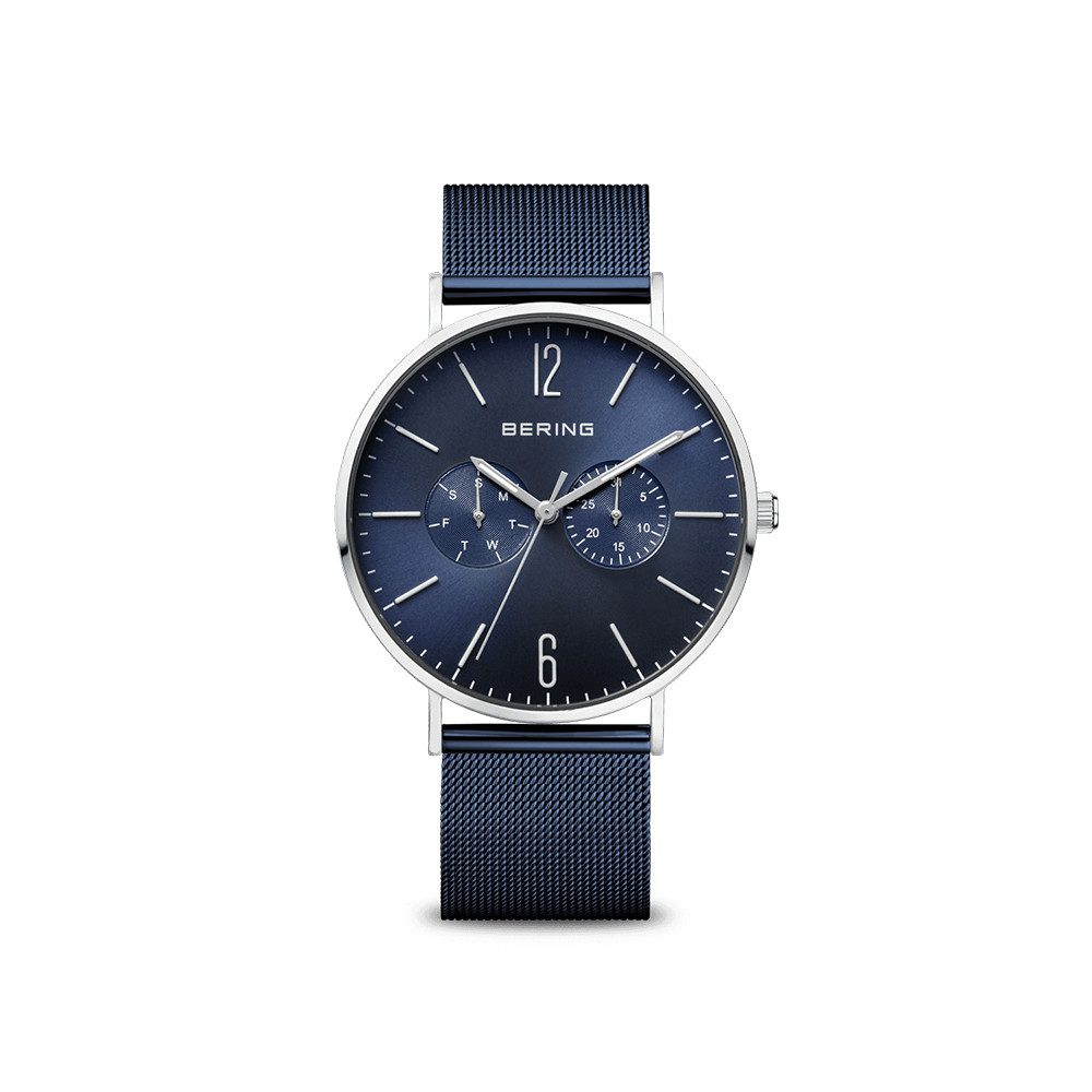 Die Bering Classic (Artikelnummer: 14240-303) vereint minimalistisches Design mit stilvollen Details. Sie besticht durch ihr silber glänzendes Edelstahlgehäuse, ein kratzfestes Saphirglas und ein modernes blaues Milanaiseband. Das blaue Sunray-Zifferblatt mit multifunktionalen Anzeigen für Wochentag und Datum macht diese Uhr zu einem unverzichtbaren Accessoire für den stilbewussten Mann. Funktionalität und Eleganz gehen bei dieser Uhr Hand in Hand und machen sie zum perfekten Begleiter für jeden Tag.