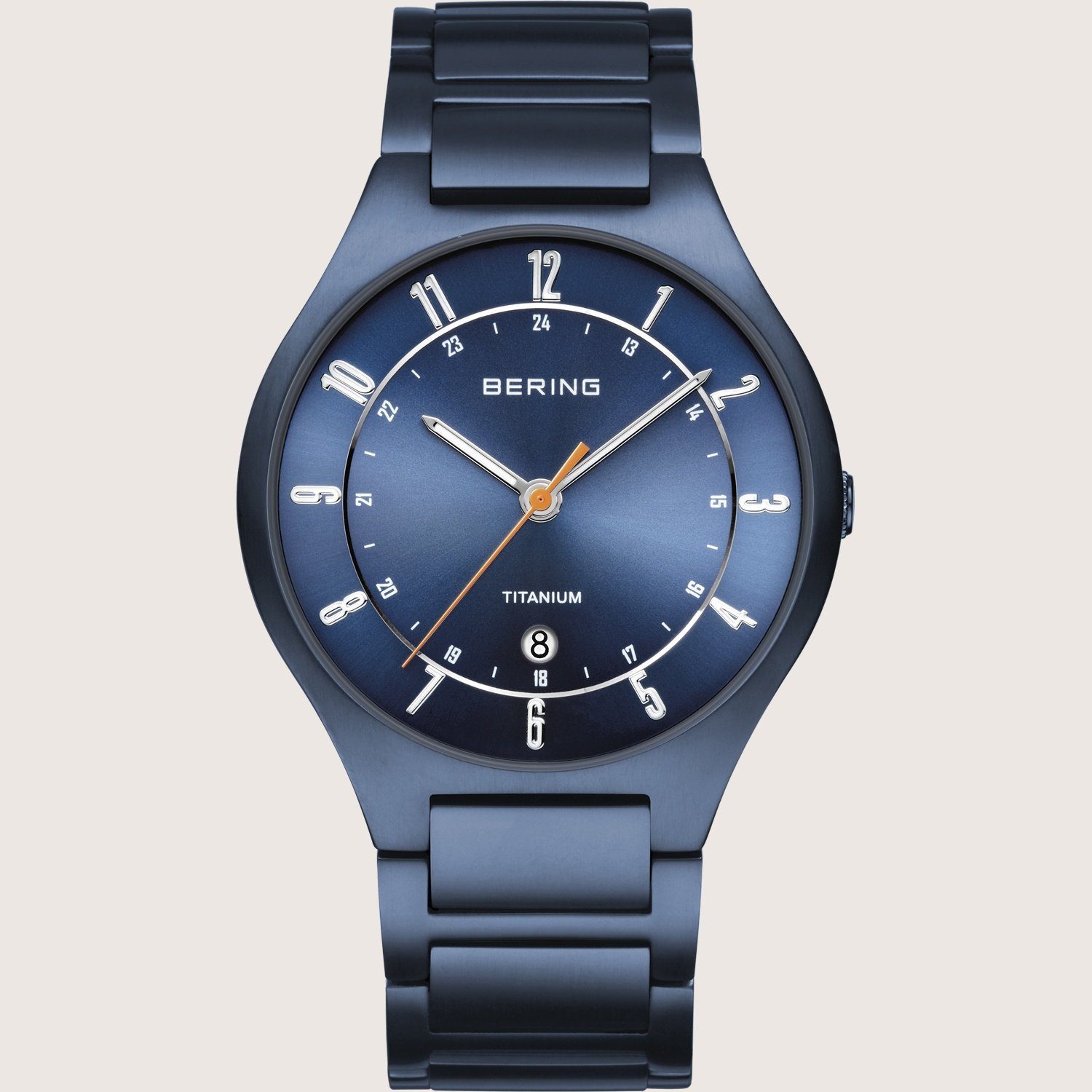 Modernes Design trifft auf technische Exzellenz in der Titanium Collection 39 mm 11739-797 von Bering. Das robuste Titan-Gehäuse mit einem Durchmesser von 39 mm verbindet Eleganz und Widerstandsfähigkeit in perfekter Harmonie. Unter dem kratzfesten Saphirglas präsentiert sich ein blaues Zifferblatt, das durch orangefarbene und silberne Zeiger ergänzt wird und eine optimale Ablesbarkeit sicherstellt. Zusätzlich bietet die Uhr eine praktische Datumsanzeige und eine Wasserdichtigkeit von bis zu 5 Bar.