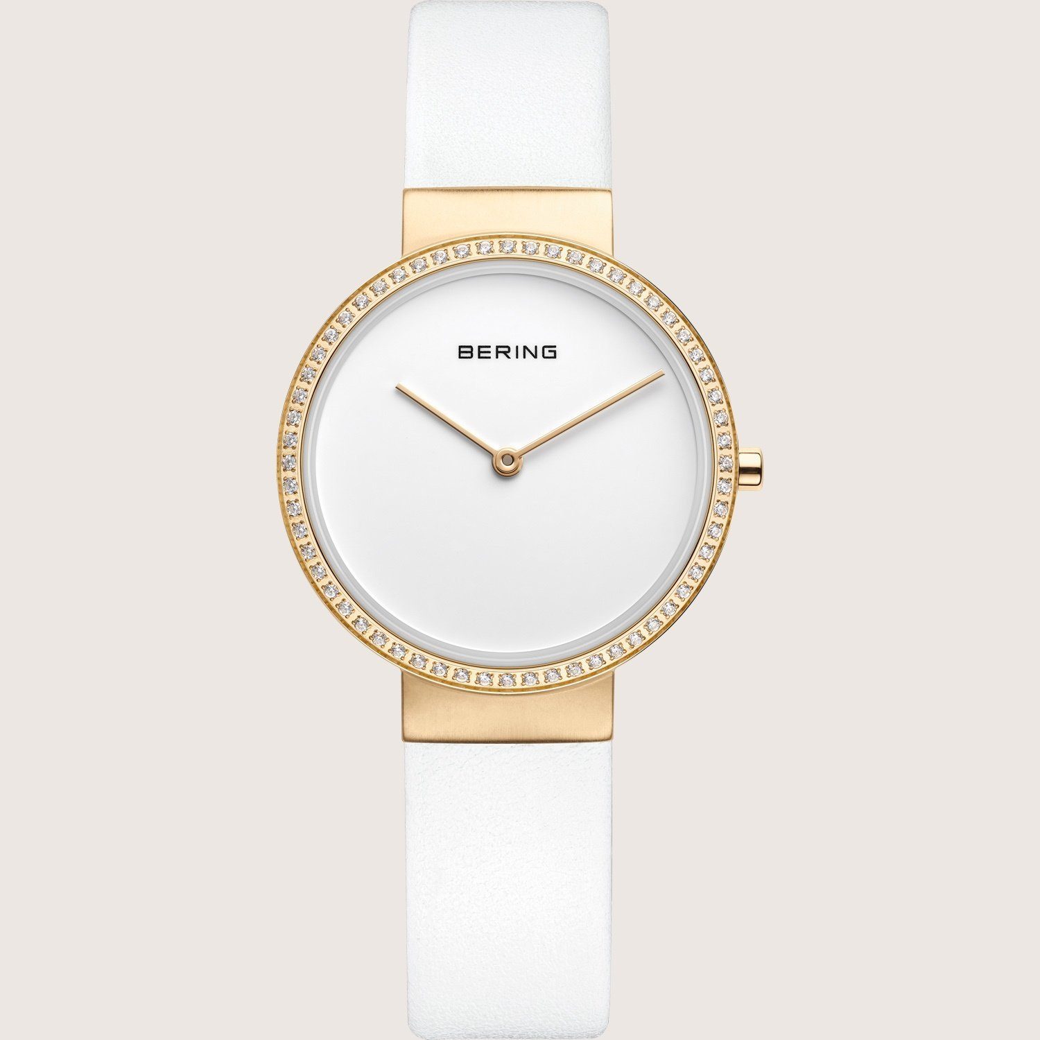 In einem harmonischen Zusammenspiel von zeitlosem Design und moderner Eleganz zeigt sich die Bering Classic Collection 31 mm 14531-630. Speziell für Damen konzipiert, besticht sie durch einen Gehäusedurchmesser von 31 mm und eine Höhe von 6 mm. Das goldgelbe Gehäuse setzt sich eindrucksvoll gegen das Weiß des Zifferblatts ab, und passende goldgelbe Zeiger, die für eine klare Ablesbarkeit sorgen, werden durch ein kratzfestes Saphirglas geschützt. Ein besonderer Hingucker ist die mit 60 Zirkonia Kristallen besetzte Lünette, die der Uhr einen funkelnden Glanz verleiht.