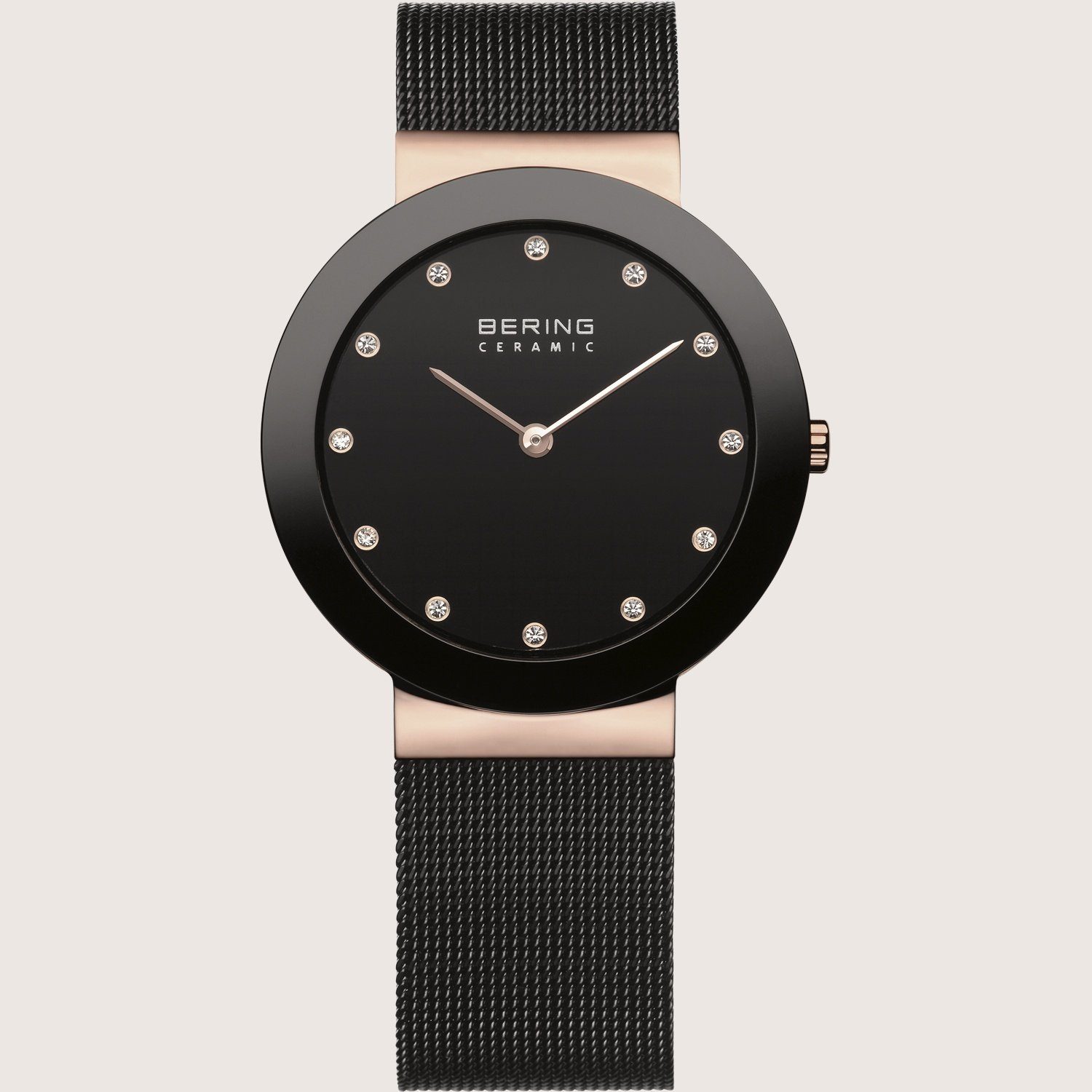 Die Bering Ceramic Collection 35 mm 11435-166 ist ein besonderes Exemplar, welches sowohl durch ihr Design als auch durch ihre technischen Spezifikationen besticht. Mit einem Gehäusedurchmesser von 35 mm und einer Gehäusehöhe von 6 mm ist sie für Damen konzipiert. Das Gehäuse ist in Roségold gehalten und aus Edelstahl gefertigt, während das schwarze Zifferblatt durch ein kratzfestes Saphirglas geschützt wird. Die Uhr verfügt über Zeiger in Rose vergoldet und einen Ziffernblatt Index aus Zirkonia.
