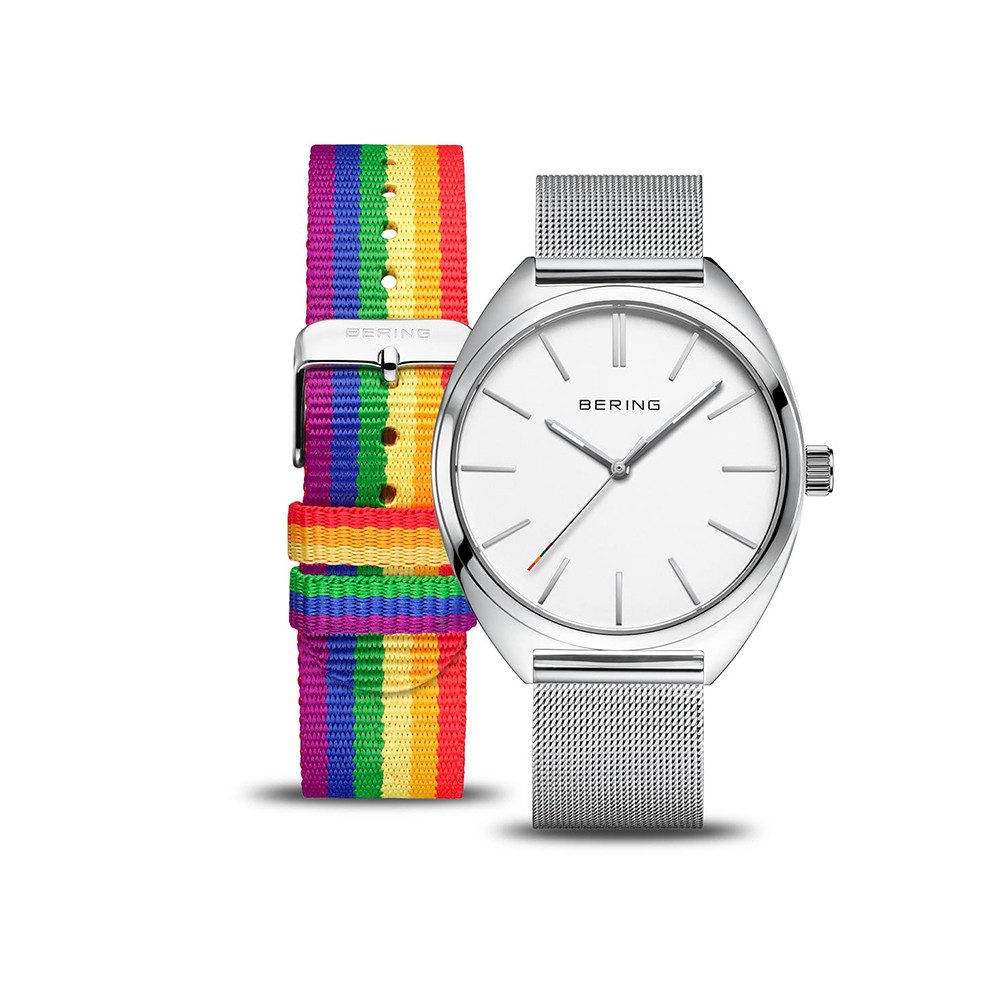 Die Bering Classic silber glänzend (Artikelnummer: 12131-014-GWP) verbindet zeitlose Eleganz mit der Kraft eines wichtigen sozialen Statements. Das Gehäuse aus silber glänzendem Edelstahl ist bis zu 5 ATM wasserdicht, was für zusätzliche Funktionalität sorgt. Auf dem weißen Zifferblatt heben sich die fluoreszierenden Zeiger und bunten Indizes hervor, die die Farben des Regenbogens widerspiegeln und für Vielfalt und Inklusion stehen. Das silberfarbene Milanaise-Armband ergänzt das minimalistische Design perfekt, während das elegante Nato-Armband in Regenbogenfarben ein starkes Zeichen für Solidarität setzt. Diese Uhr ist mehr als nur ein Accessoire – sie ist ein kraftvolles Symbol für eine gerechtere Welt.