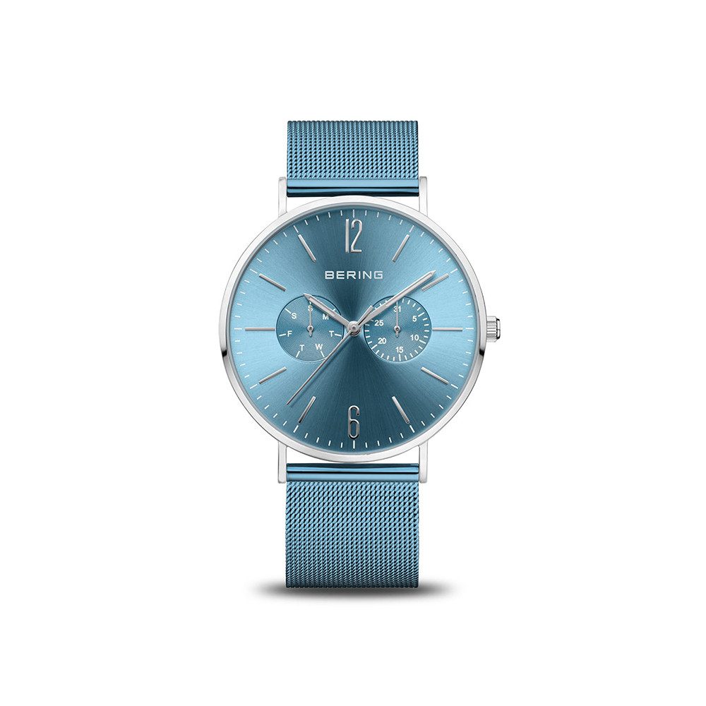 Die Bering Classic silber glänzend (Artikelnummer: 14240-809) vereint minimalistisches Design mit hochwertigen Materialien. Das silber glänzende Edelstahlgehäuse und das feine blaue Milanaise-Armband sorgen für eine zeitlose Eleganz. Mit einem robusten Saphirglas bleibt die Uhr über Jahre hinweg frei von Kratzern, während das präzise Quarzuhrwerk eine verlässliche Zeitangabe garantiert. Das blaue Sunray-Zifferblatt mit silberfarbenen Akzenten rundet das puristische Design harmonisch ab. Perfekt für Männer, die schlichte Eleganz schätzen.