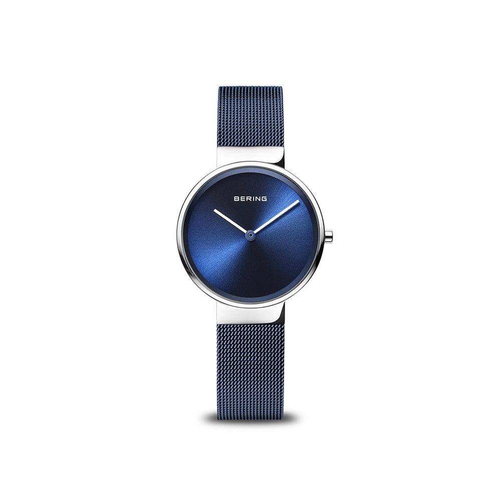 Bering Classic (Artikelnummer: 14531-307) bringt das Beste des minimalistischen dänischen Designs in ein zeitlos elegantes Accessoire. Die Uhr vereint ein silberfarben poliertes und gebürstetes Edelstahlgehäuse mit einem feingliedrigen Milanaise-Armband in Blau, was den klassischen Bering-Look perfekt verkörpert. Ein Sunray-Zifferblatt, geschützt durch kratzfestes Saphirglas, ergänzt die edle Anmutung der Uhr und sorgt für eine lange Lebensdauer. Präzises Quarzuhrwerk und eine Wasserdichtigkeit bis 5 ATM machen die Uhr alltagstauglich und stilvoll zugleich – ideal für alle, die stilvollen Minimalismus schätzen.