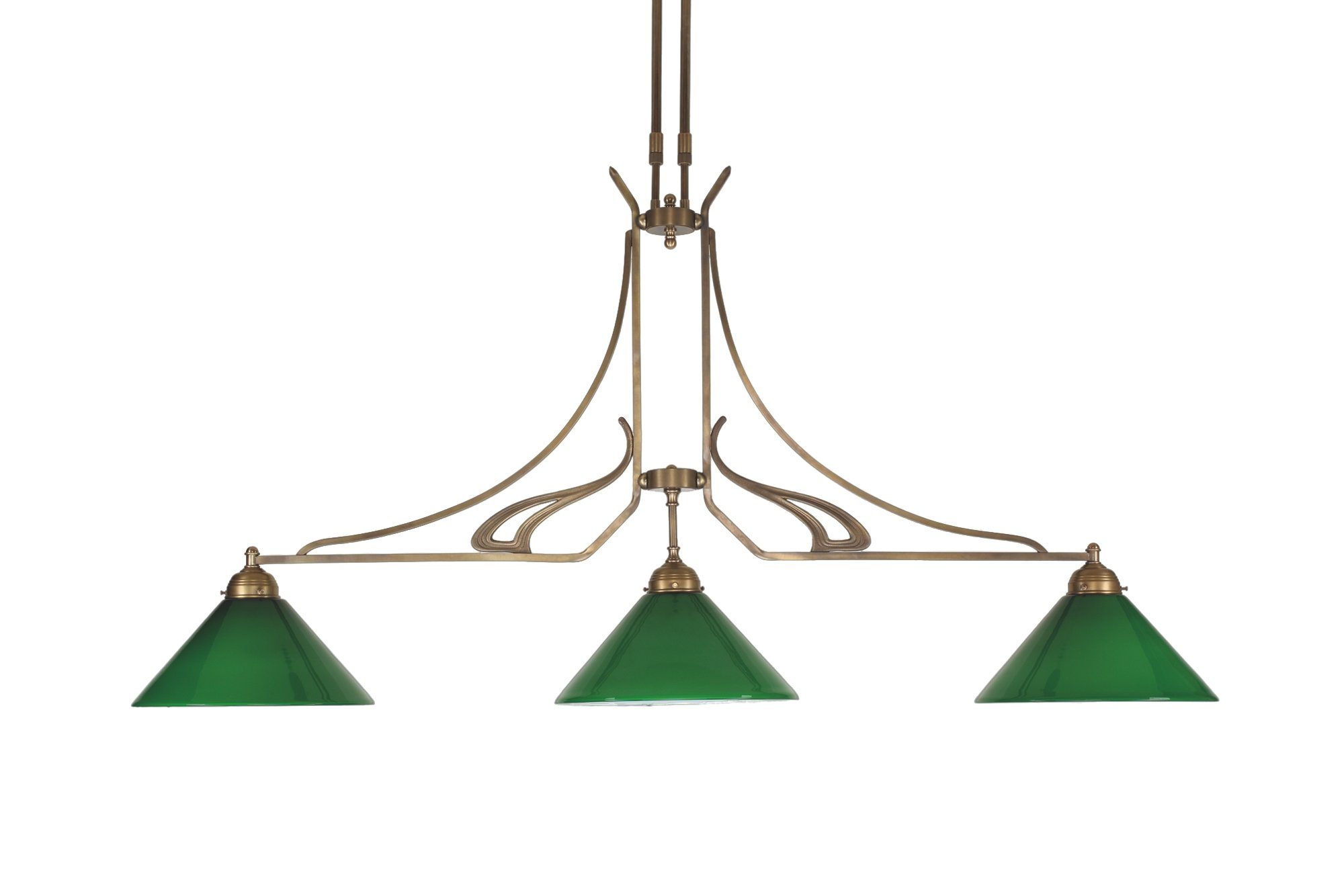 Die drei konischen, grün glänzenden Gläser erinnern an historische Schreibtischleuchten und verleihen jedem Raum ein kultiviertes Licht. Das filigrane, handgefertigte Gestell sorgt mit seinen geschwungenen Linien für Leichtigkeit und Struktur – ein echtes Statement an der Decke, ohne sich aufzudrängen.