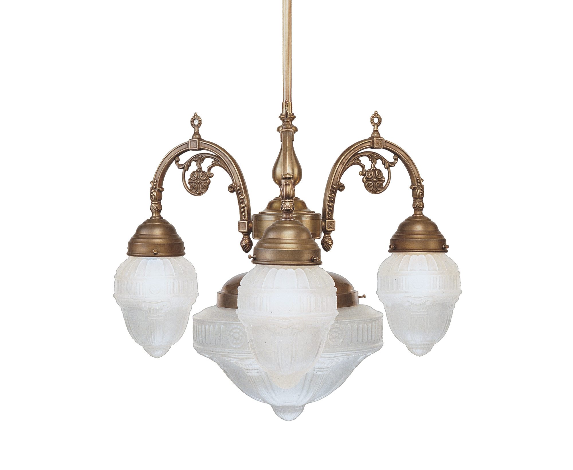 Die vier aufwendig gestalteten Gläser in grau satiniertem Finish erinnern mit ihren Reliefstrukturen an klassische Architekturdetails – fast wie kleine Lichtskulpturen. Getragen werden sie von kunstvoll gebogenen Armen, die dem Gestell in Berliner Messing eine imposante, aber harmonische Präsenz verleihen. Kurz: ein Stück Geschichte, das jetzt Decke macht.