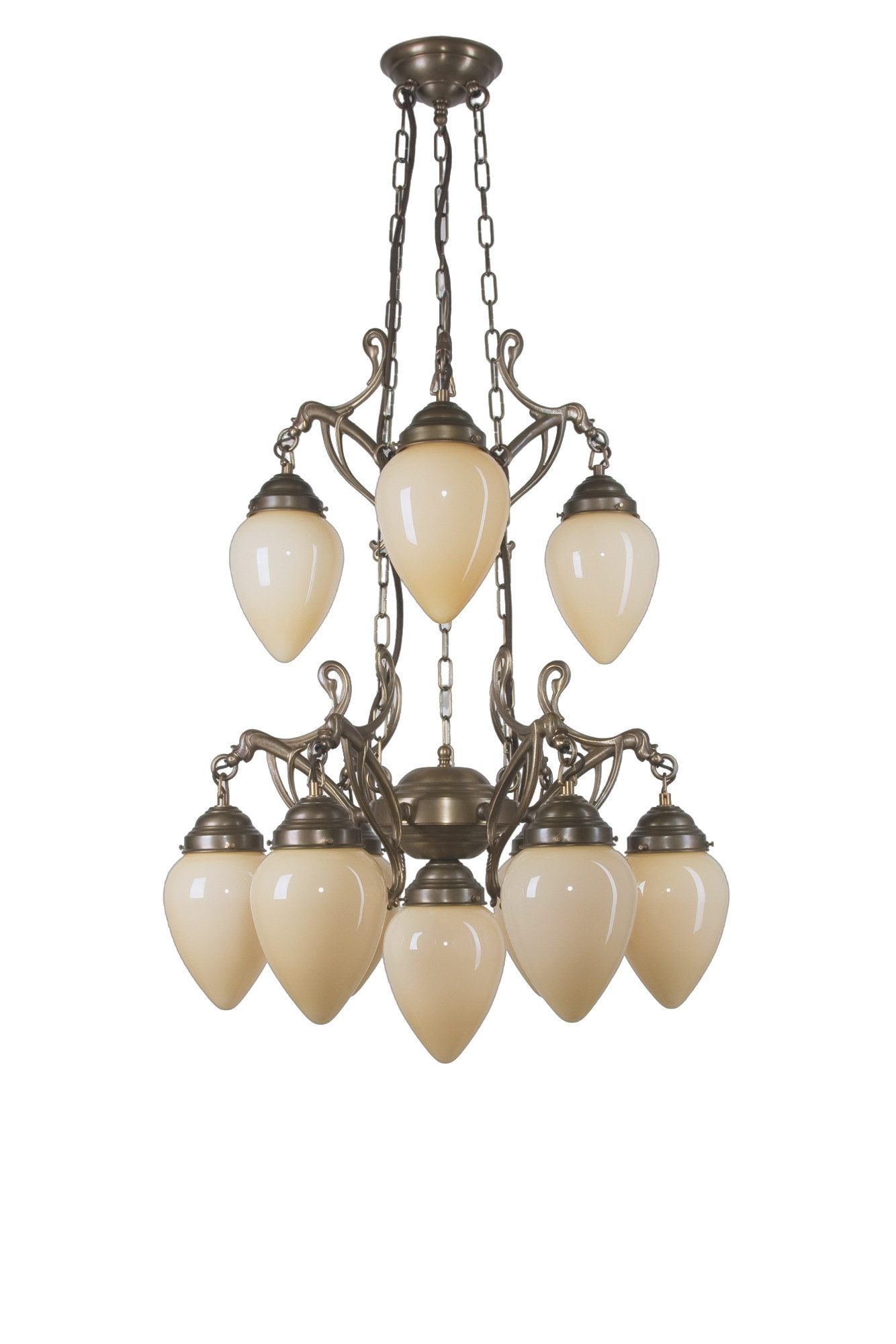 Wer sagt, dass Eleganz immer leise sein muss, hat diesen Kronleuchter noch nicht gesehen. Der D232-123eb-B ist ein imposantes Lichtkunstwerk mit zehn stilvollen Glaskörpern in zartem Elfenbein, die an antike Tropfen erinnern und wie schwebende Lichtperlen an kunstvoll geschwungenem Berliner Messing hängen.