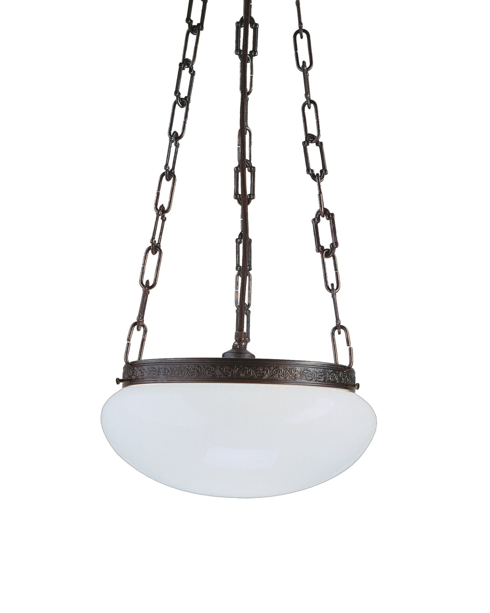 Hier hängt nichts schief: Drei massive Ketten halten den fein verzierten Metallring sicher an Ort und Stelle. Der antik patinierte Rahmen trägt das mundgeblasene, opalweiße Glas mit einer Selbstverständlichkeit, als hätte es nie etwas anderes getan. Das Ergebnis? Ein stilvolles Gesamtbild mit einem Hauch von Jahrhundertwende.