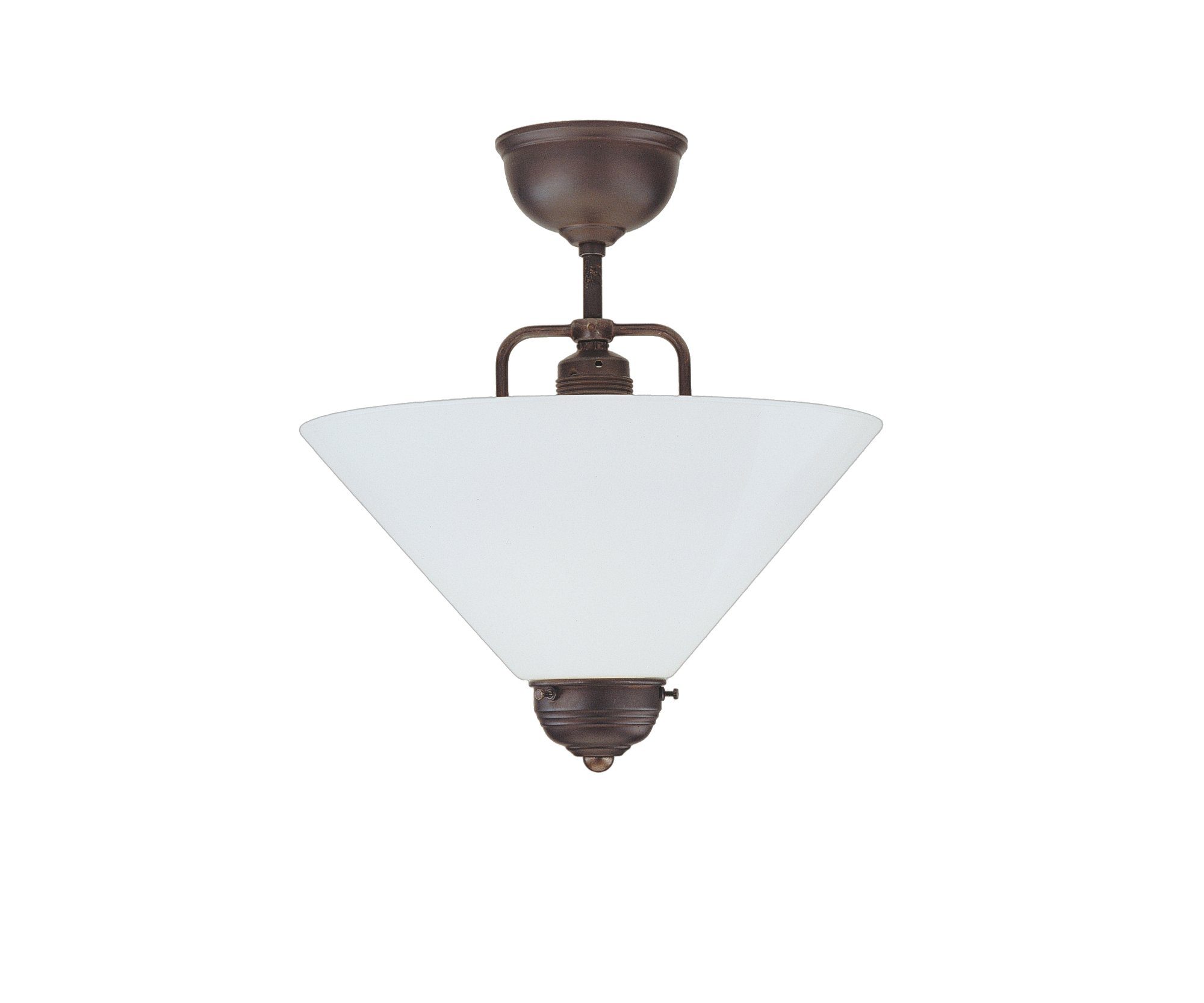 Das opalweiße Glas in geometrischer Trichterform sorgt für angenehmes, gleichmäßiges Licht – perfekt für Flure, Küchen oder überall dort, wo Stil nicht fehlen darf. Die antik patinierte Halterung fügt sich charmant in klassische wie moderne Räume ein.