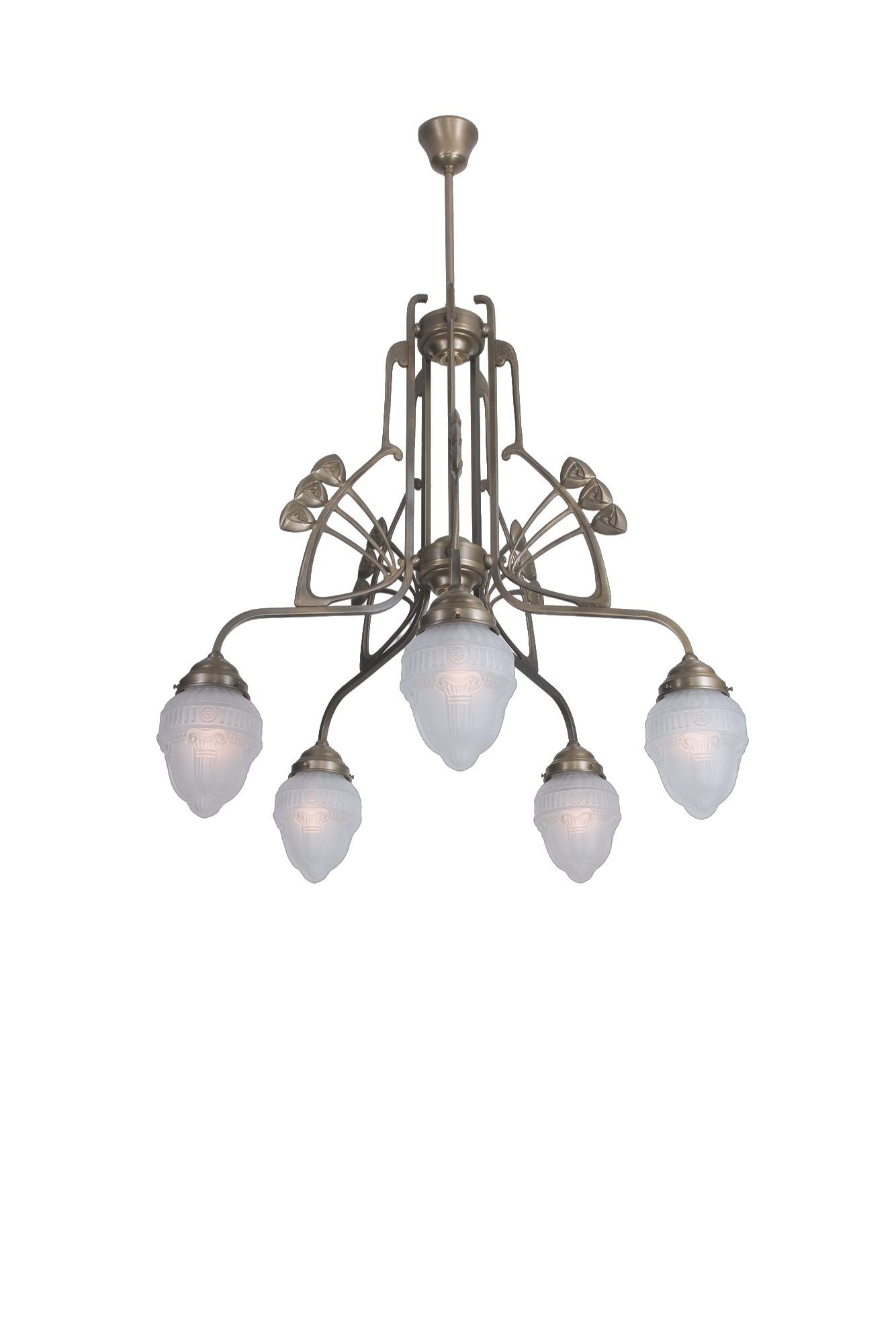 Fünf fein geschwungene Leuchtenarme entfalten sich wie ein Lichtfächer unter einer fast skulpturalen Mittelachse. Verzierungen im Jugendstil, florale Elemente und satiniertes Glas mit feiner Reliefstruktur machen aus jeder Glühbirne ein Stück Poesie. Der warme Ton des Berliner Messings verleiht der Leuchte dabei eine erhabene Tiefe – edel, aber nie aufdringlich.