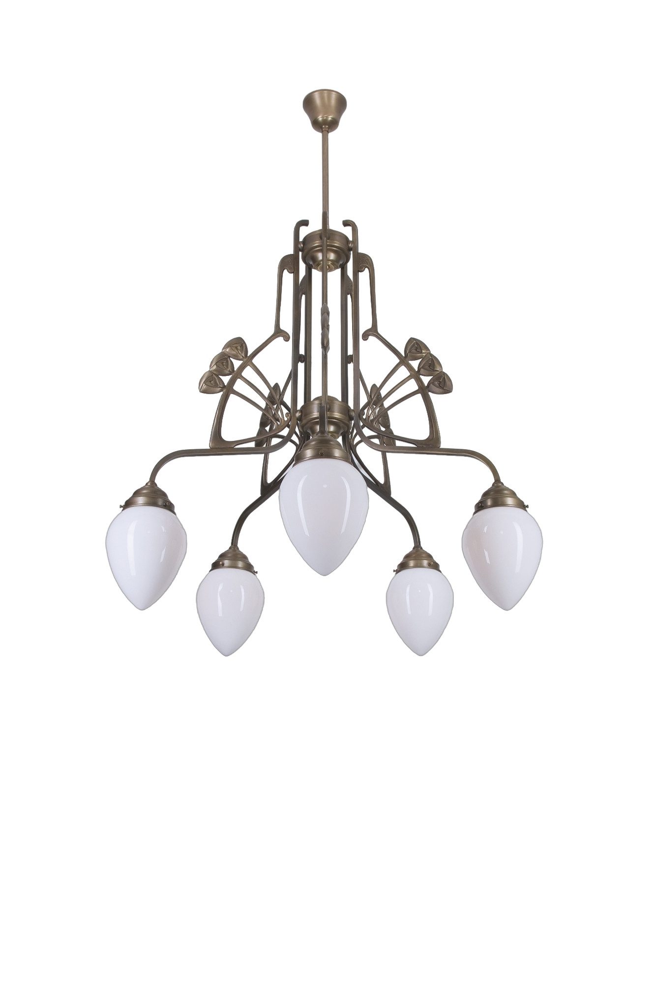 Sein durchdachter Aufbau mit vertikalen Streben, zarten Jugendstilelementen und fein geschwungenen Armen erinnert an klassische Baukunst – nur eben mit Glühbirnen. Die opalweißen Glasleuchten sorgen für ein sanftes, gleichmäßiges Licht, das sich wunderbar für Wohnräume, Salons oder große Essbereiche eignet.