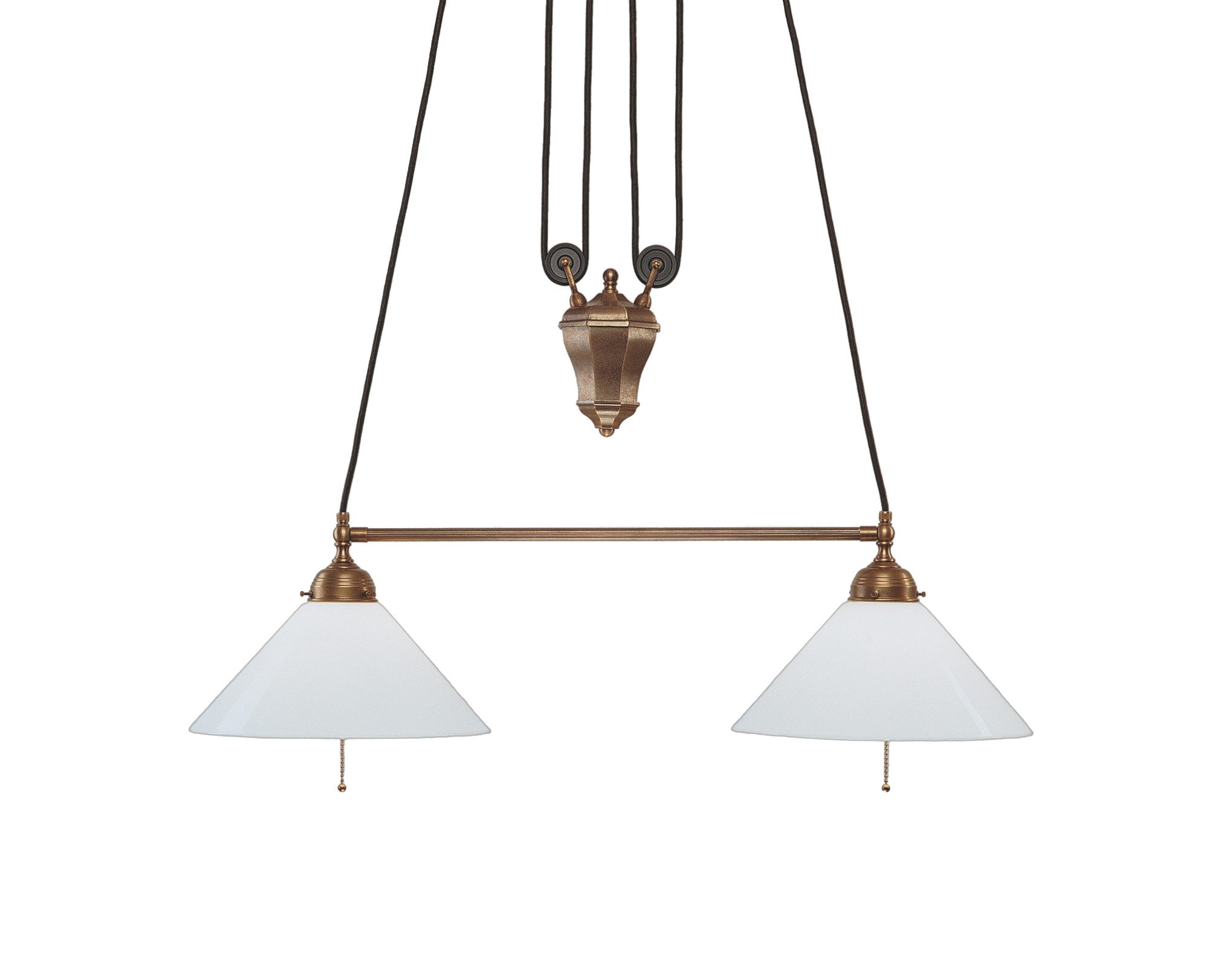 Ob als stilvolle Tischbeleuchtung im Esszimmer oder über dem Billardtisch im Herrenhaus-Look – diese Leuchte bringt Stil und Funktionalität zusammen wie kaum eine andere. Der fein gearbeitete Gegenzug-Mechanismus mit zwei dekorativen Seilrollen lässt sich spielend leicht in der Höhe verstellen. Und die beiden opalweißen Schirme sorgen für sanftes, blendfreies Licht mit maximalem Retro-Flair.