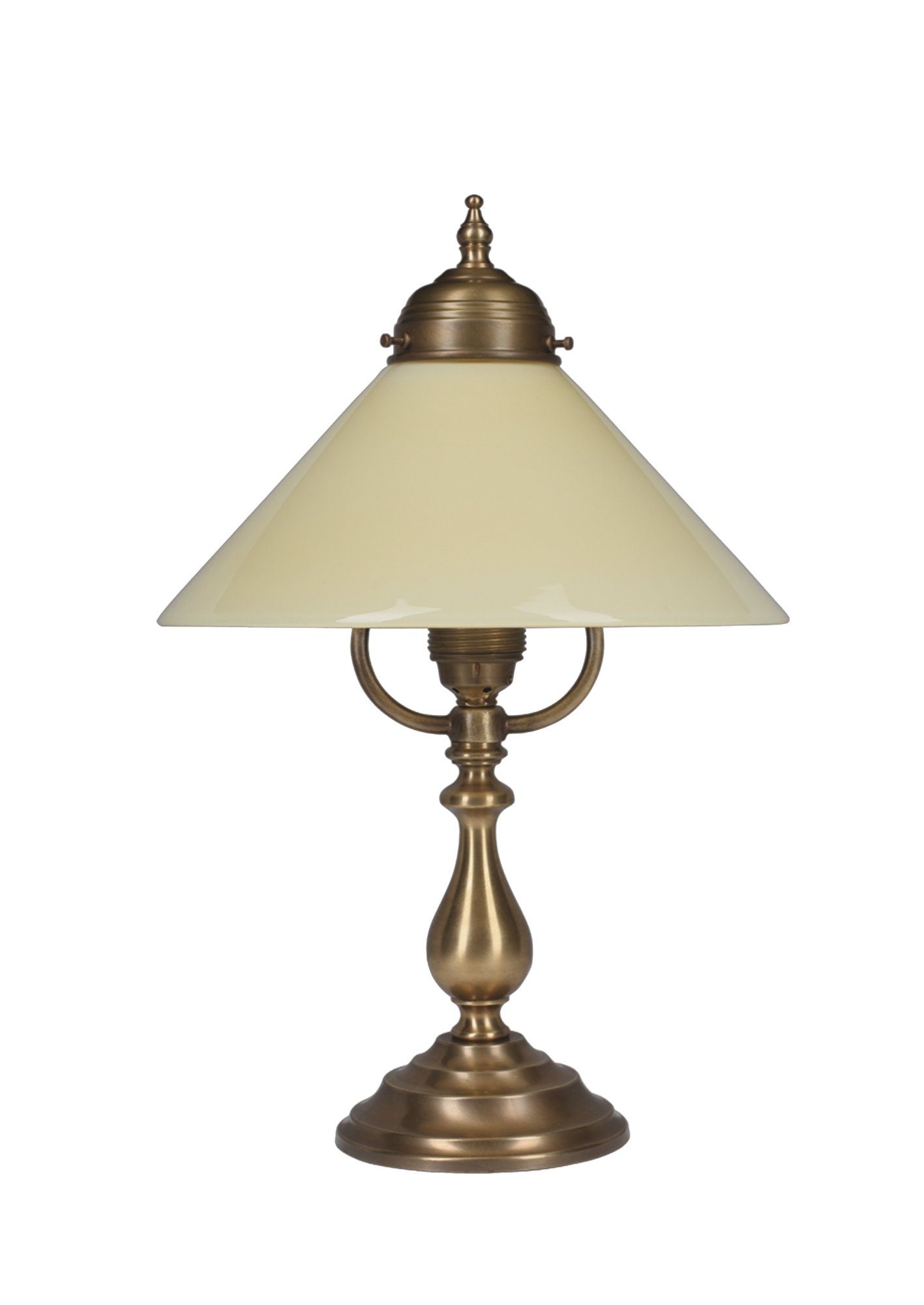 Die Tischleuchte V2-25eb B ist ein hochwertiges Produkt der Berliner Messinglampen. Der elfenbeinfarbene Lampenschirm ist aus Glas gefertigt, und das Gestell ist in einem Berliner Messing Finish gehalten.