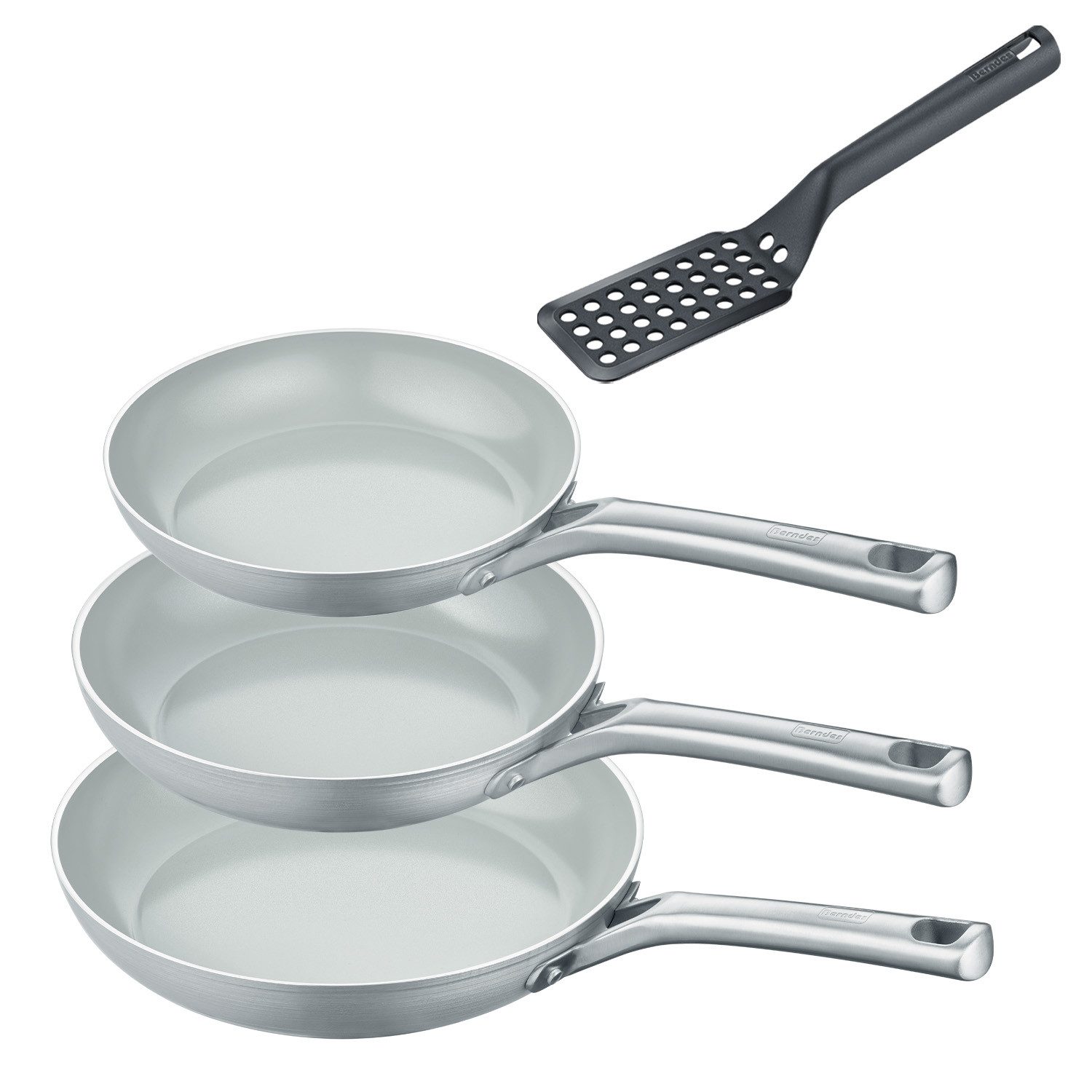Vorteilsset im 4er-Bundle, bestehend aus Pfannenwender und drei Bratpfannen aus einer gelungenen Kombination recycelten Aluminiums aus Dosen, unserer umweltschonenden b.nature Quarz-Versiegelung sowie einem Edelstahl-Stiel in doppelt genieteter Ausführung. Das Aussehen punktet durch einen natürlichen Look, von dem auch Profi-Köche begeistert wären.