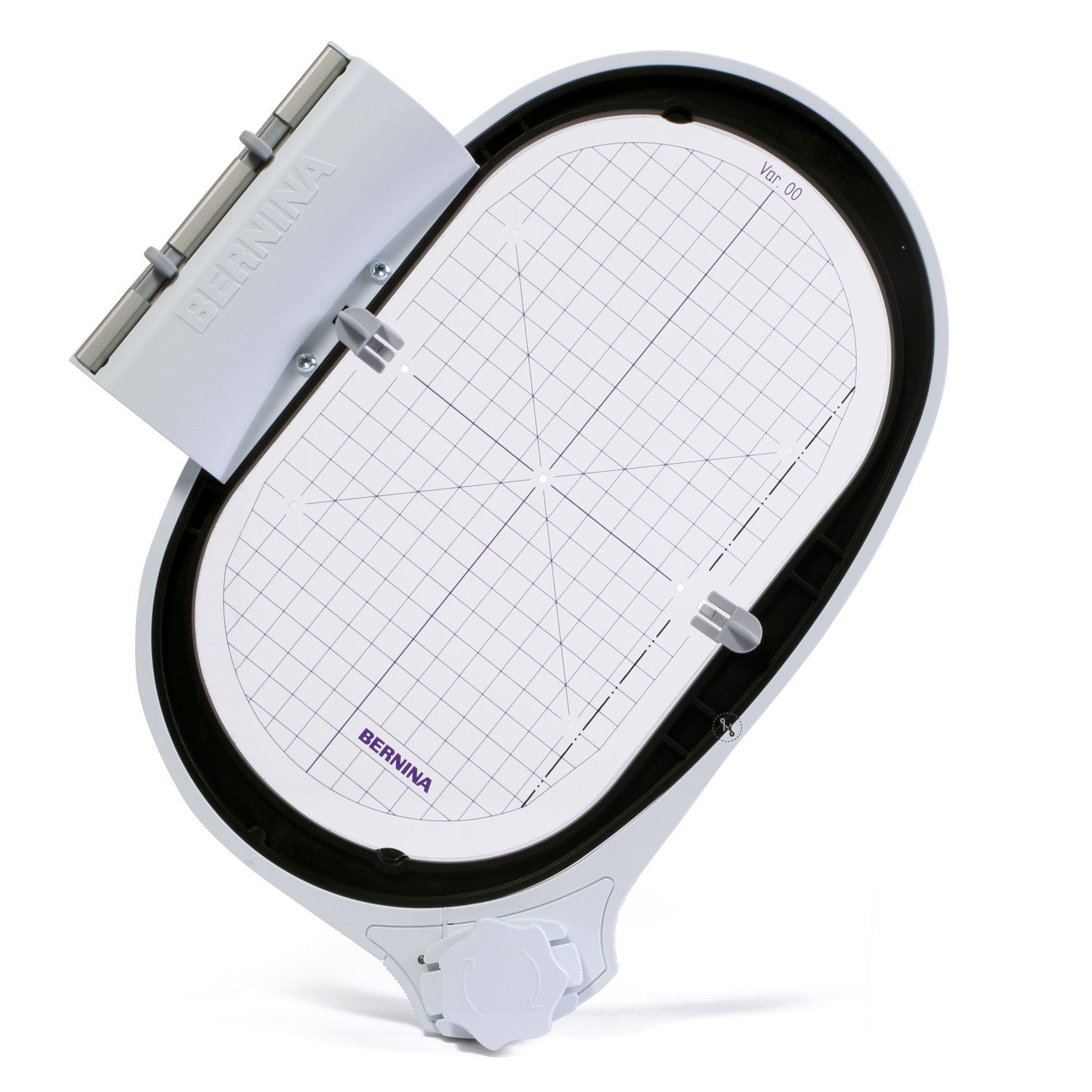 Der große Freiarm-Stickrahmen von Bernina sorgt dafür, dass schlauchförmige Textilien einfach bestickt werden können. So lassen sich zum Beispiel Taschen, Kissenhüllen oder Stoffbeutel schnell und ohne auftrennen der Nähte mit dem gewünschten Motiv besticken. Der Rahmen hat eine Stickfläche von 14,50 cm x 25,50 cm, das Mindestmaß zum Besticken der Projekte liegt bei 80 cm im Umfang. Das Raster auf der Schablone sorgt für eine optimale Positionierung innerhalb des Rahmens.