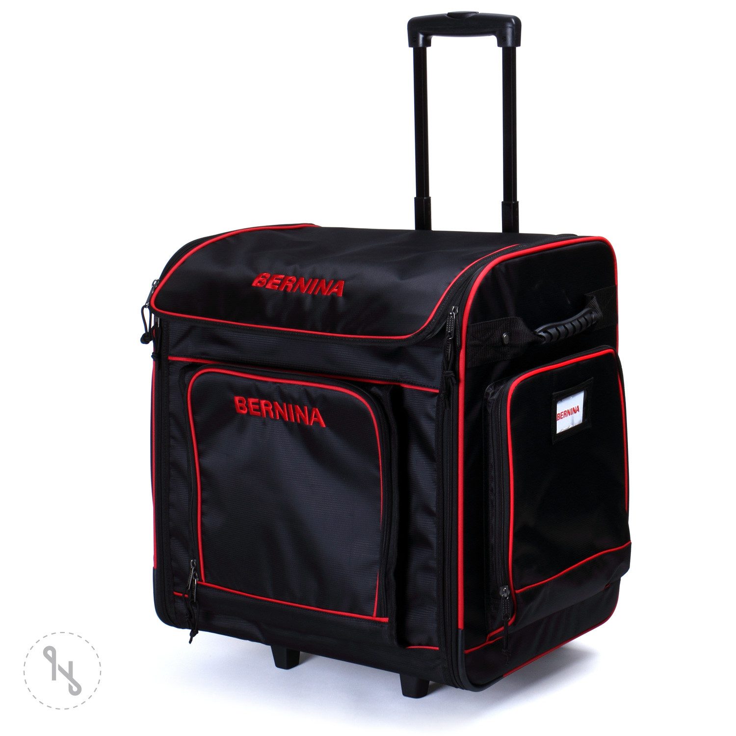 Der Bernina Trolley ist stabil und dank der allseitigen Polsterung ist die Maschine auch optimal geschützt. Dabei kann die Overlock durch die langen Reißverschlüsse und den seitlichen Griffen von der Seite oder von oben zum Transport ein und ausgeladen werden. Dabei sorgt der Teleskoptragegriff und die robusten Rollen für eine sichere Handhabung. In den vielen Innen- und Aussenfächern findet sich reichlich Platz für das Zubehör.