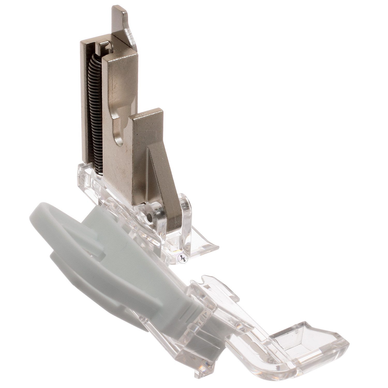 Mit dem Bernina XL Paspelfuß gelingt es ganz einfach große Paspeln mit einem Durchmesser von 6, 8 und 10 mm selbst zu erstellen und einzunähen. Die Höhenverstellung der Führungsrille lässt sich dabei durch Zusammenpressen und schieben ideal an die Paspeldicke anpassen. So entstehen mühelos dekorative Effekte an Nähprojekten. Für 3-/4-Faden Overlockstiche ist dieser Fuß perfekt geeignet.