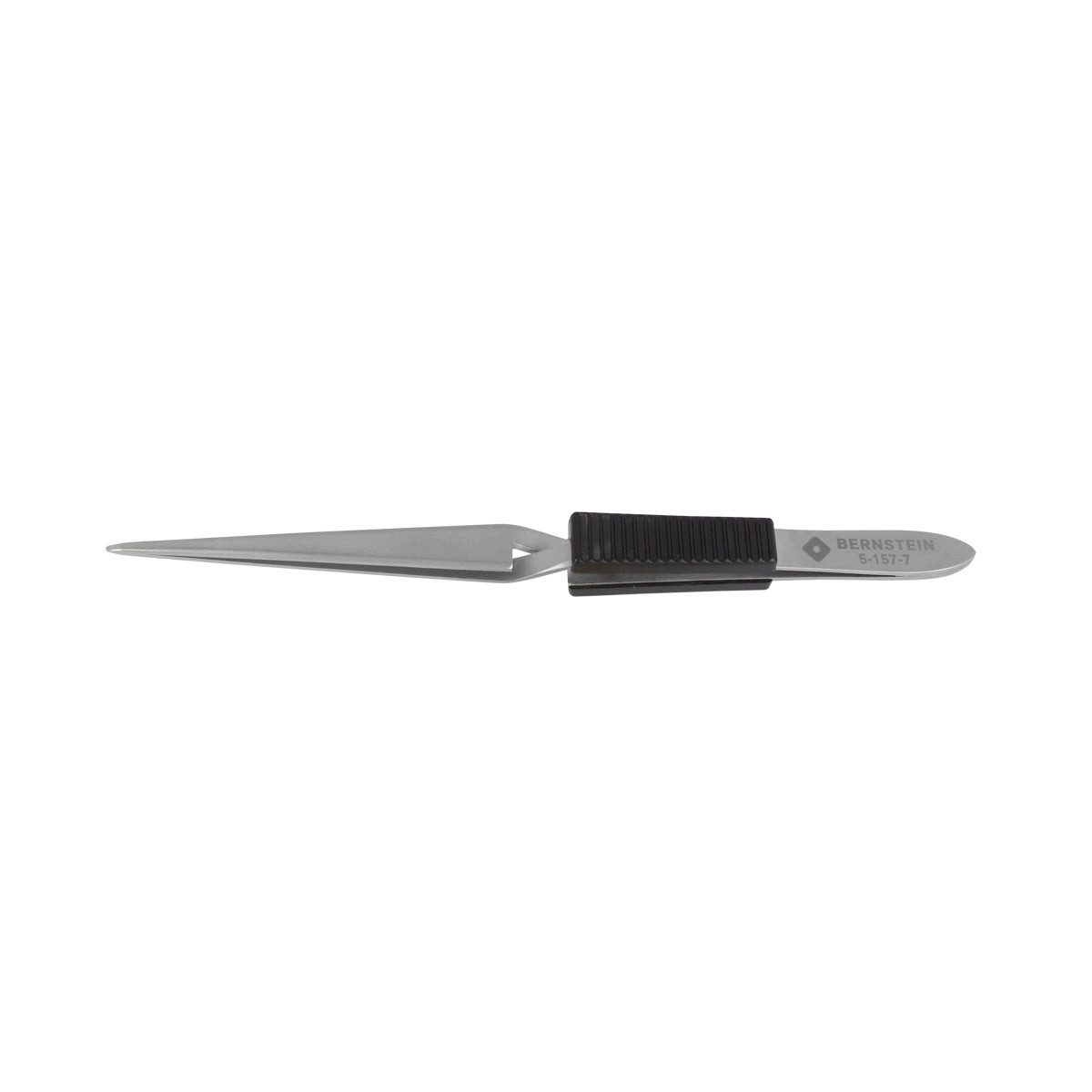 Löt-Kreuzpinzette (Festhaltepinzette) aus Edelstahl, mit feinen, glatten, geraden Spitzen, Griff-Flächen aus Kunststoff.