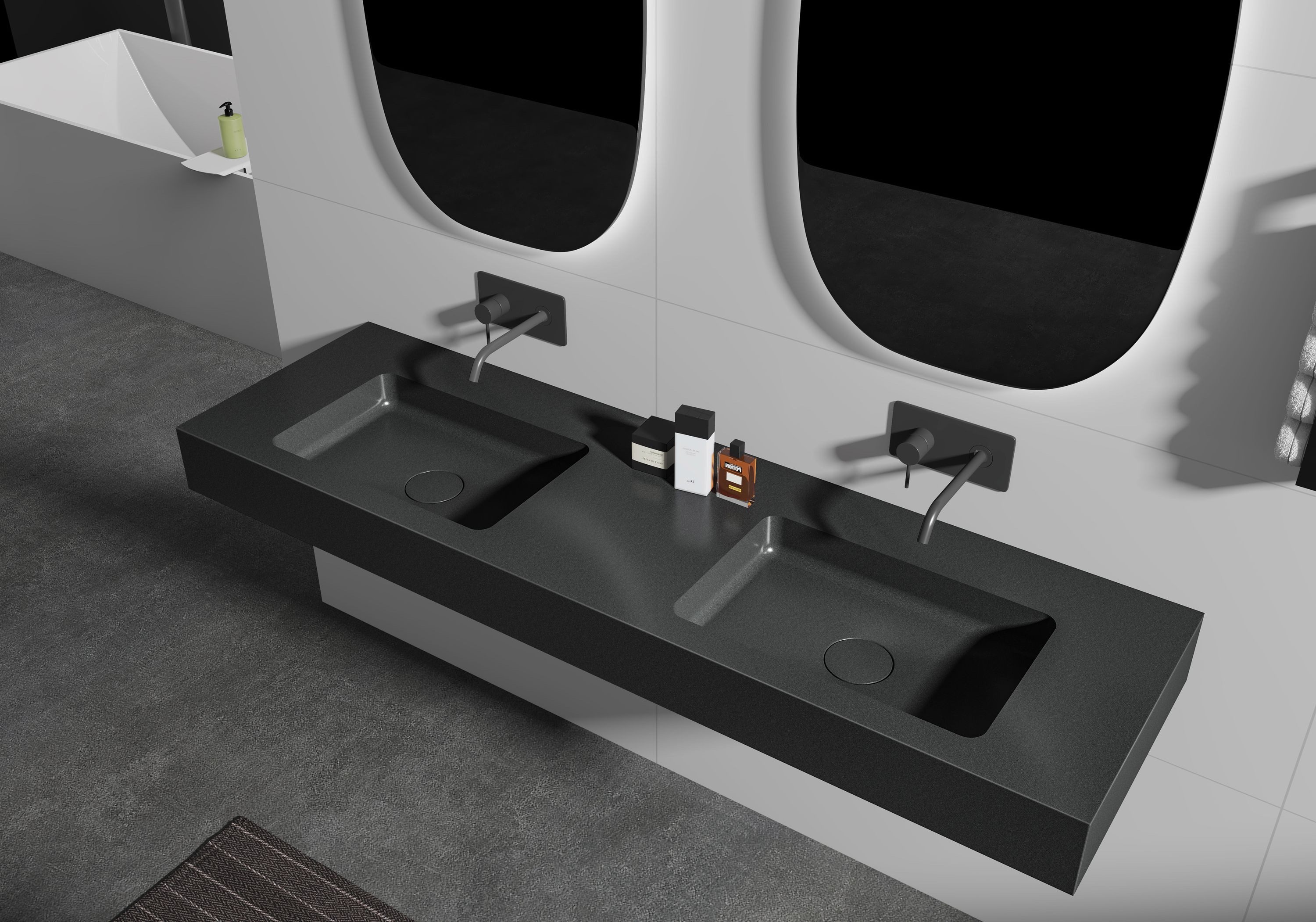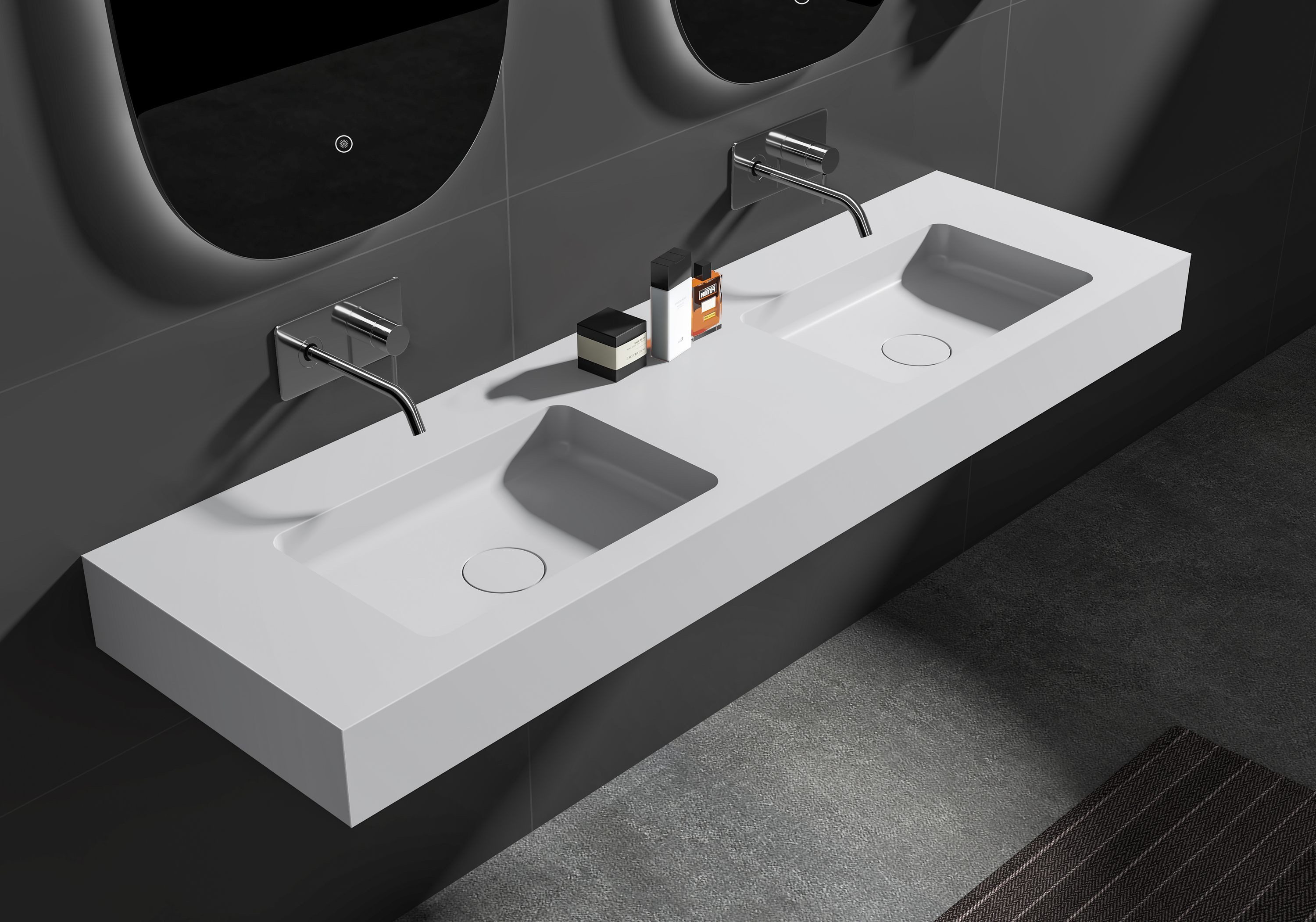 Doppelwaschtisch BA8016 mit mittiger Ablagefläche - optional mit Metallkonsole BA8016 ist ein sehr schönes Wandwaschbecken für eine Großfamilie, denn es passt perfekt in ein geräumiges Badezimmer. Die Breite beträgt 163 cm und Sie können an den beiden Beckenmulden bequem zu zweit die Morgentoilette erledigen. Eine großzügige Ablagefläche ist ebenfalls vorhanden. Die Armaturlöcher sind nicht vorgebohrt. Sie haben die Wahl zwischen einer Aufsatz- oder Unterputzarmatur. Der Doppelwaschtisch BA8016 ist in klassischem Weiß matt und edlem Quarz Schwarz über die Artikelvariante wählbar. Das schwarze Becken ist mit einer Quarzsand-Beschichtung versehen, die einen matten Kristallglanz vorweist und zudem extrem kratzfest und antibakteriell ist. Das Wasser perlt ab und hinterlässt kaum Rückstände. Das weiße Becken ist mit einer Gel-Coat-Beschichtung versehen, die glatt, porenlos und somit sehr hygienisch ist. Für noch mehr Ablagefläche ist eine zusätzliche Metallkonsole aus Edelstahl mit schlag- und kratzfester, pulverbeschichteter Oberfläche in Schwarz verfügbar. Spezifikationen Material Mineralguss Solid Stone Farbe wählbar Weiß matt | Quarz Schwarz Form Rechteckig Maße 163 x 45 x 12 cm (B x T x H) Gewicht Netto 39,8 kg / Brutto 43,5 kg Maße Verpackung 170 x 52 x 20 cm Впередe Details Geeignet für Aufsatz- und Unterputzarmatur (Armaturloch nicht vorgebohrt) Weiß matt: Einfache Reinigung dank glatter, porenfreier Oberfläche mit Gel-Coat-Beschichtung; Oberfläche bleibt hygienisch und antibakteriell Quarz Schwarz: Glatte und extrem kratzfeste Oberfläche - Wasser fließt schnell und rückstandsfrei ab; Oberfläche bleibt fleckenfrei, hygienisch und antibakteriell Montagelöcher Rückseite vorgebohrt Warme, samtige Oberflächenhaptik Keine scheuernden Mittel/Tücher verwenden Farbbeständigkeit - keine Vergilbung Mit Ablaufgarnitur Ohne Überlauf Ohne Armatur Ohne Deko-Artikel