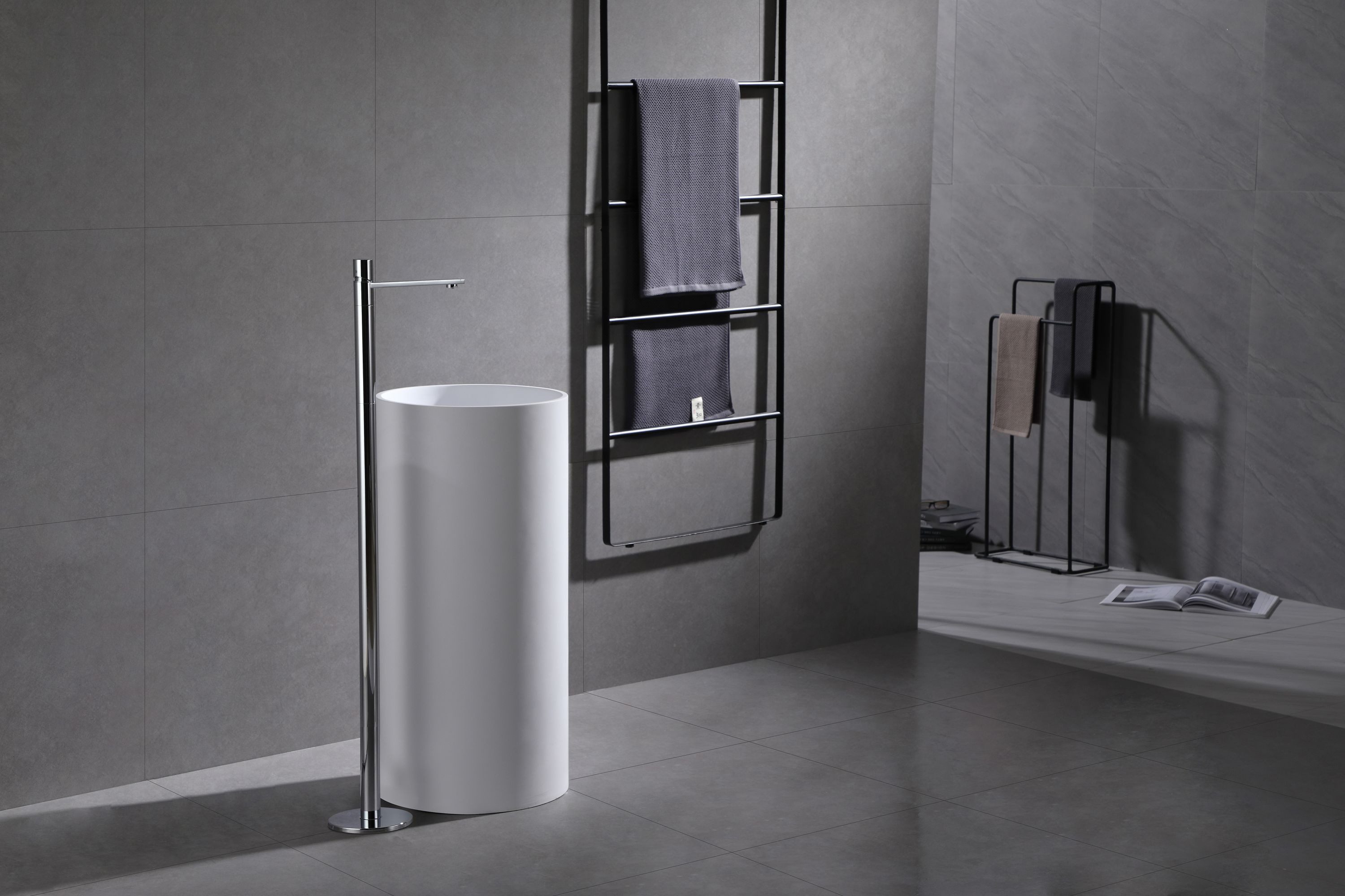 BERNSTEIN Standarmatur freistehende Waschtischarmatur 8046 - Farbe wählbar Die freistehende Waschtischarmatur 8046 ist die ideale Ergänzung zu Ihrem Standwaschbecken und besticht durch ihr minimalistisches Aussehen. Sie ist mit einer qualitativ hochwertigen Keramik-Kartusche ausgestattet und ein integrierter Strahlregler sorgt durch Luftbeimischung im Wasserstrahl für einen sparsamen Wasser- und Energieverbrauch. Die Armatur ist erhältlich in Chromoptik und einer Pulverbeschichtung in Schwarz matt, dessen Oberfläche besonders kratzfest ist. Der schwenkbare Auslauf bietet Ihnen zusätzlichen Bedienkomfort, außerdem sind im Lieferumfang flexible Anschlussschläuche enthalten. Die BERNSTEIN Standarmatur freistehende Waschtischarmatur 8046 ist für unsere Standwaschbecken geeignet. Spezifikationen Material Kern aus Messing Oberfläche Verchromt, Pulverbeschichtung Farbe wählbar Chromoptik | Schwarz matt Gesamthöhe 112 cm Höhe Auslauf 106 cm Ausladung 26,5 cm Durchmesser Steigrohr 4 cm Maße Verpackung 35 x 5 x 10 cm Gewicht Netto 3,4 kg / Brutto 3,7 kg Armaturenart Einhebelmischer Montage Bodenmontage, freistehend Arbeitsbereich Von 0,5 bar bis 8 bar, bei max. 90°C Wasseranschluss 1/2", genormt 2 flexible Anschlussschläuche Auslauf schwenkbar, 360 Grad Griffposition Oben Впередes Geeignet für Gas- und Elektro-Durchlauferhitzer Ohne Ablaufgarnitur
