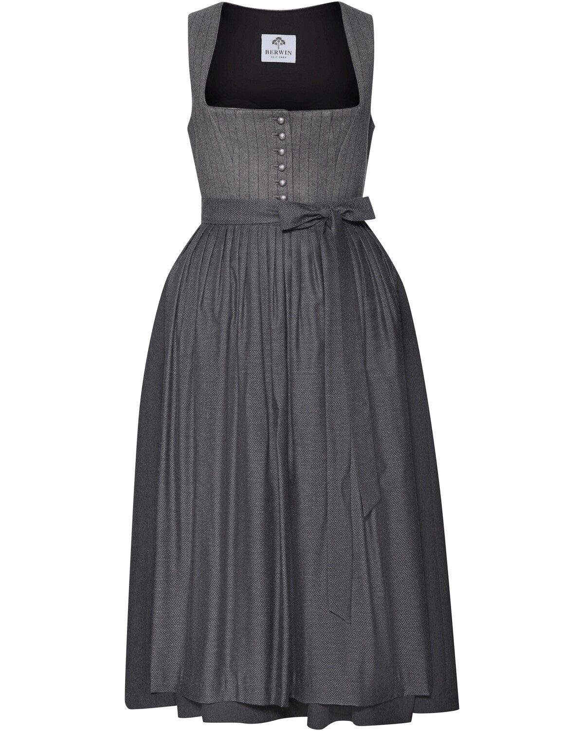 Zeitlose Eleganz für traditionelle Anlässe Das Dirndl von Berwin ist ein klassisches Schmuckstück, das sich perfekt für festliche und traditionelle Anlässe eignet. Mit seinem geknöpften Design und dem winterlichen Nadelstreifen-Oberteil strahlt es zeitlose Eleganz aus. Der fließende, einfarbige Rock ergänzt das Oberteil mit einer traditionellen Note und sorgt für ein harmonisches Gesamtbild. Die passende Jacquard-Schürze mit Bindeschleife fügt dem Ensemble eine verspielte Nuance hinzu, die das Dirndl zu einem stilvollen Begleiter macht. Die sorgfältig ausgewählten Details wie das Paspel im Balkonett-Ausschnitt und die hochwertigen Trachten-Zierknöpfe setzen elegante Akzente und zeigen die Liebe zum Detail, die dieses Kleidungsstück auszeichnet. Praktische Details und hochwertige Verarbeitung Neben seiner ansprechenden Optik bietet das Dirndl von Berwin auch praktische Merkmale, die den Tragekomfort erhöhen. Der in Falten gelegte Rock ist mit seitlichen Taschen ausgestattet, die diskreten Stauraum bieten, ohne den klassischen Look zu beeinträchtigen. Mit einer Rocklänge von 80 cm ist das Dirndl ideal für verschiedene Anlässe, von festlichen Feierlichkeiten bis hin zu traditionellen Veranstaltungen. Die Kombination aus hochwertigen Materialien und präziser Verarbeitung garantiert ein angenehmes Tragegefühl und eine lange Lebensdauer. Dieses Dirndl ist die perfekte Wahl für Trachtenliebhaberinnen, die Wert auf Qualität und stilvolle Details legen und dabei bewundernde Blicke auf sich ziehen möchten. Oberstoff: 64% Polyester, 34% Viskose, 2% Elasthan; Futter: 97% Baumwolle, 3% Elasthan; Sonstige Materialien: Rock, 100% Polyester, Schürze, 60% Viskose, 40% Polyester