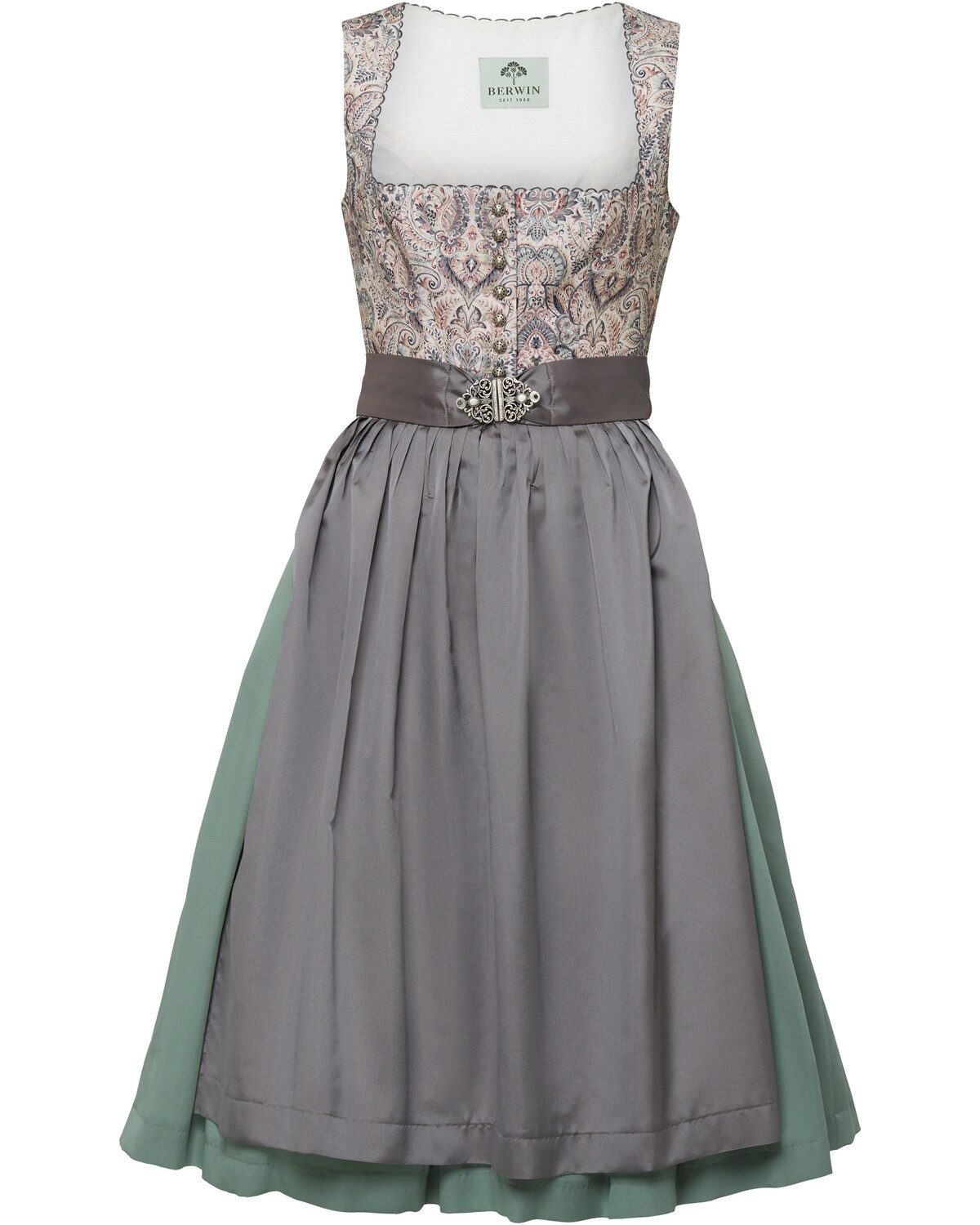Das klassische, geknöpfte Midi-Dirndl von Berwin verbindet traditionellen Charme mit zeitloser Eleganz und ist damit die ideale Wahl für festliche Anlässe. Das Oberteil aus festem Baumwoll-Druckmaterial sorgt nicht nur für einen authentischen Look, sondern auch für Stabilität und Komfort. Der fließende Rock aus hochwertigem Lyocell schmiegt sich sanft an den Körper und kreiert eine ansprechende Silhouette, die sowohl feminin als auch stilvoll wirkt. Die passende Taftschürze, die vorne mit einer Schließe versehen ist, rundet das Ensemble ab und verleiht dem Dirndl eine raffinierte Note. Besondere Details wie das Bogenband im Ausschnitt und die eleganten silberfarbenen Knöpfe setzen geschmackvolle Akzente und zeugen von der Detailverliebtheit des Designs. Der in Falten gelegte Rock bietet nicht nur eine ansprechende Optik, sondern auch praktische seitliche Taschen, die für zusätzlichen Stauraum sorgen. Mit einer Rocklänge von 70 cm ist dieses Dirndl ideal für traditionelle Feierlichkeiten und besondere Anlässe. Es vereint die perfekte Mischung aus Tradition und modernem Stil und wird garantiert bewundernde Blicke auf sich ziehen. Die Kombination aus hochwertigen Materialien und durchdachtem Design macht dieses Dirndl zu einem zeitlosen Begleiter, der in keiner Garderobe fehlen sollte. Oberstoff: 100% Baumwolle; Futter: 65% Polyester, 35% Baumwolle; Sonstige Materialien: Schürze, 60% Viskose, 40% Polyester, Rock, 100% Lyocell