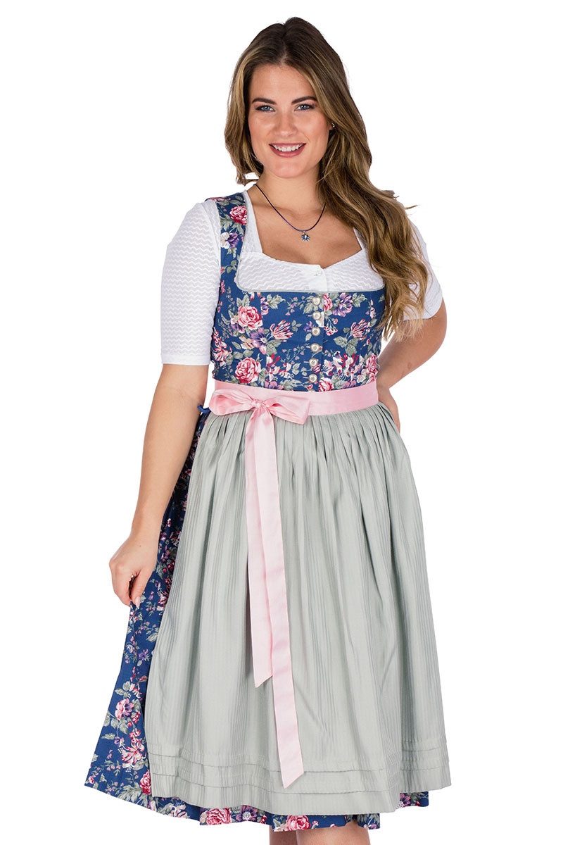 Dieses romantische, wadenlange Midi Dirndl namens Henrietta besteht aus feiner, angenehmer Baumwolle und hat allover ein grandioses Printmuster aus großen, detailreichen Blumen im Realistic-Design. Die Knopfleiste vorn am sauber abgefütterten, taillierten Mieder ist mit altsilbernen Ösenknöpfen mit zartem, floralem Motiv besetzt und der leicht abgerundete Balconette-Ausschnitt mit Schürzenstoff abgepaspelt. Der traumhafte, in breite Kellerfalten gelegte Rock verfügt beidseitig über Eingrifftaschen. Zum Dirndl wird das formidable, knapp wadenlange Trachtenkleid durch die hinreißende, fein schimmernde Schürze mit dem zarten Fischgrat-Webmuster in dezentem Grün und dem glanzvollen Schürzenbindeband aus reiner Seide in Rosa. Am Bund ist die Dirndlschürze zudem in schmale Falten gelegt und den Schürzenabschluss schmücken zwei Biesen. Bitte beachten Sie die Größenzuschläge ab Размер 48. Im Lieferumfang sind das Dirndl und die Schürze enthalten, eine Dirndlbluse ist nicht inbegriffen.