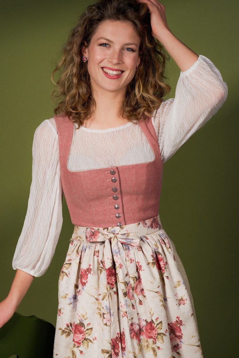 Dieses anmutige Midi Dirndl "Pauleen" präsentiert sich im romantischen Mustermix und hat eine kniebedeckende Длина. Das Miederoberteil besteht größtenteils aus Baumwolle, ist tailliert geschnitten, sauber abgefüttert und zeigt ein schönes Fischgrat-Webmuster in Hellrot und Beige. Der Balconette-Ausschnitt ist mit einer zarten, dezent glänzenden Posamentenborte verziert. Die Knopfleiste schmücken zauberhafte Ösenknöpfe in zartem Kupfer mit einem hübschen Ornamentikblüten-Motiv. Der knapp wadenlange Rock aus Baumwolle und Leinen im Twill-Stil ist in schöne Kellerfalten gelegt und beidseitig mit Eingrifftaschen ausgestattet. Das breite Schürzenbindeband hält die zart schimmernde, am Bund geraffte Schürze in Jacquard-Art mit floralem Ornamentik-Webmuster, die zudem wundervoll mit mehrfarbigen Blumen-Arrangements bedruckt ist. Dieses Dirndl eignet sich auch hervorragend als Hochzeitsdirndl. Im Lieferumfang sind das Dirndl und die Schürze enthalten; die Bluse ist nicht inbegriffen.