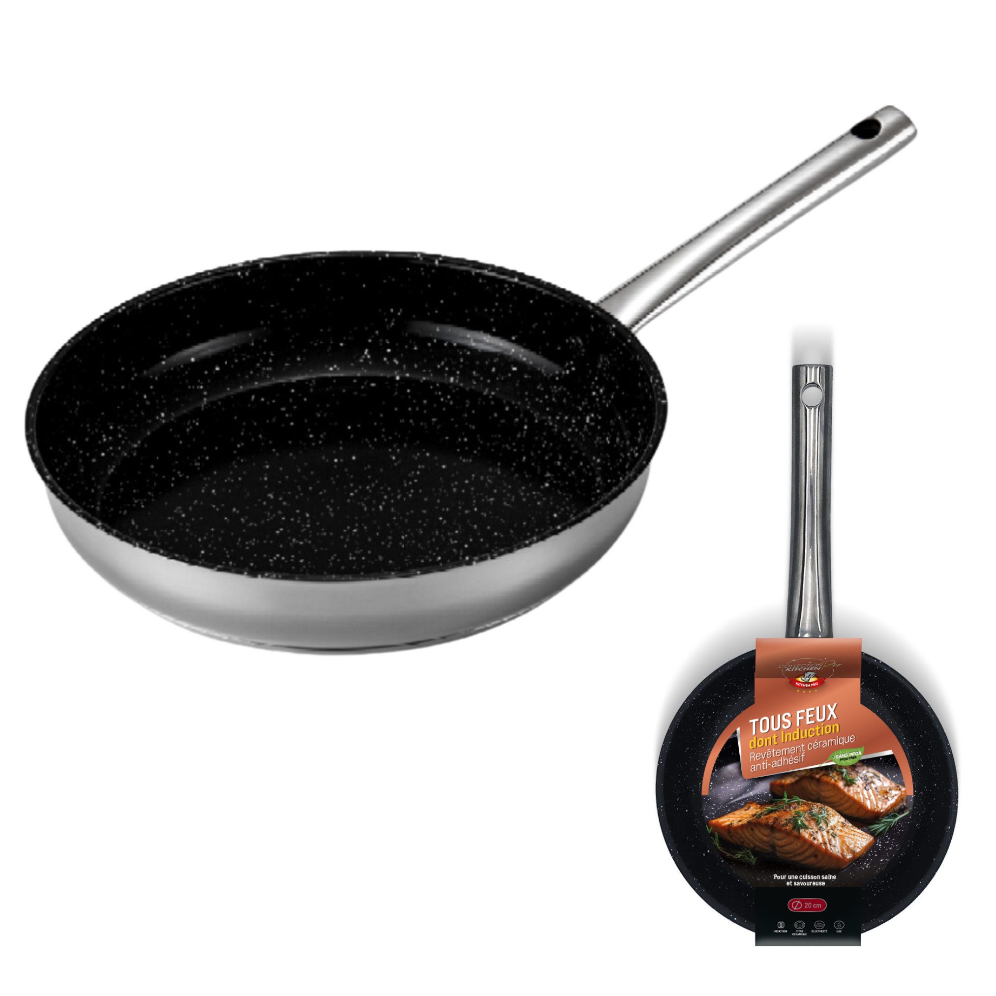 Entdecken Sie die Vielseitigkeit und Qualität der KITCHENPRO Edelstahlpfanne. Dank seiner Kompatibilität mit allen Arten von Kochfeldern können Sie es überall verwenden, egal ob auf einem Induktionskochfeld, Glaskochfeld, Elektro- oder Gasherd. Die Antihaft-Keramikbeschichtung ermöglicht ein gesünderes Kochen ohne Zugabe von Fett und stellt sicher, dass die Lebensmittel nicht kleben. Hergestellt aus lebensmittelechtem Edelstahl, ist es widerstandsfähig und elegant. Sie können aus verschiedenen Durchmessern 20cm, 24cm oder 28cm) wählen, um Ihren spezifischen Anforderungen gerecht zu werden. Kochen Sie mit der KITCHENPRO Edelstahlpfanne sicher und genießen Sie köstliche und gesunde Mahlzeiten.