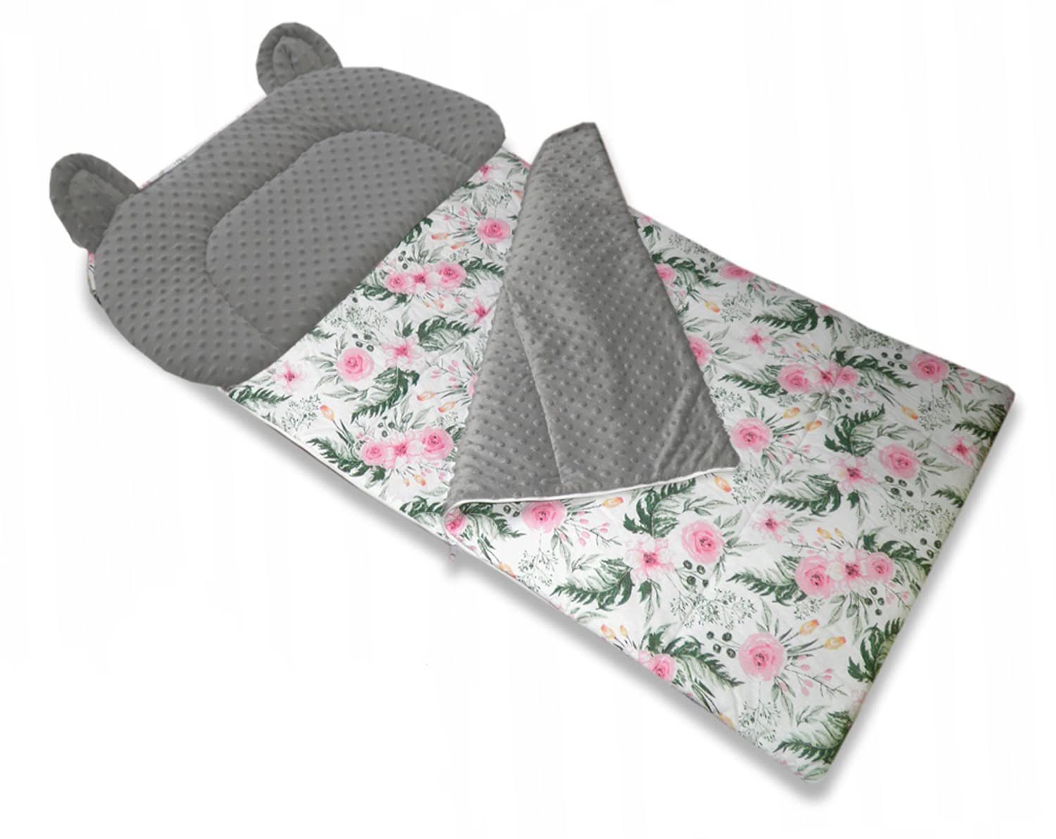 Die wendbare Konstruktion vereint zwei Oberflächen: auf der einen Seite atmungsaktive 100% Baumwolle, auf der anderen kuscheliger Minky-Plüsch. Gefüllt mit einer weichen, antiallergischen Füllung sorgt das Set für angenehme Wärme, Geborgenheit und höchsten Komfort. Dank der leichten und kompakten Verarbeitung ist es perfekt geeignet für unterwegs oder kleinere Räume.