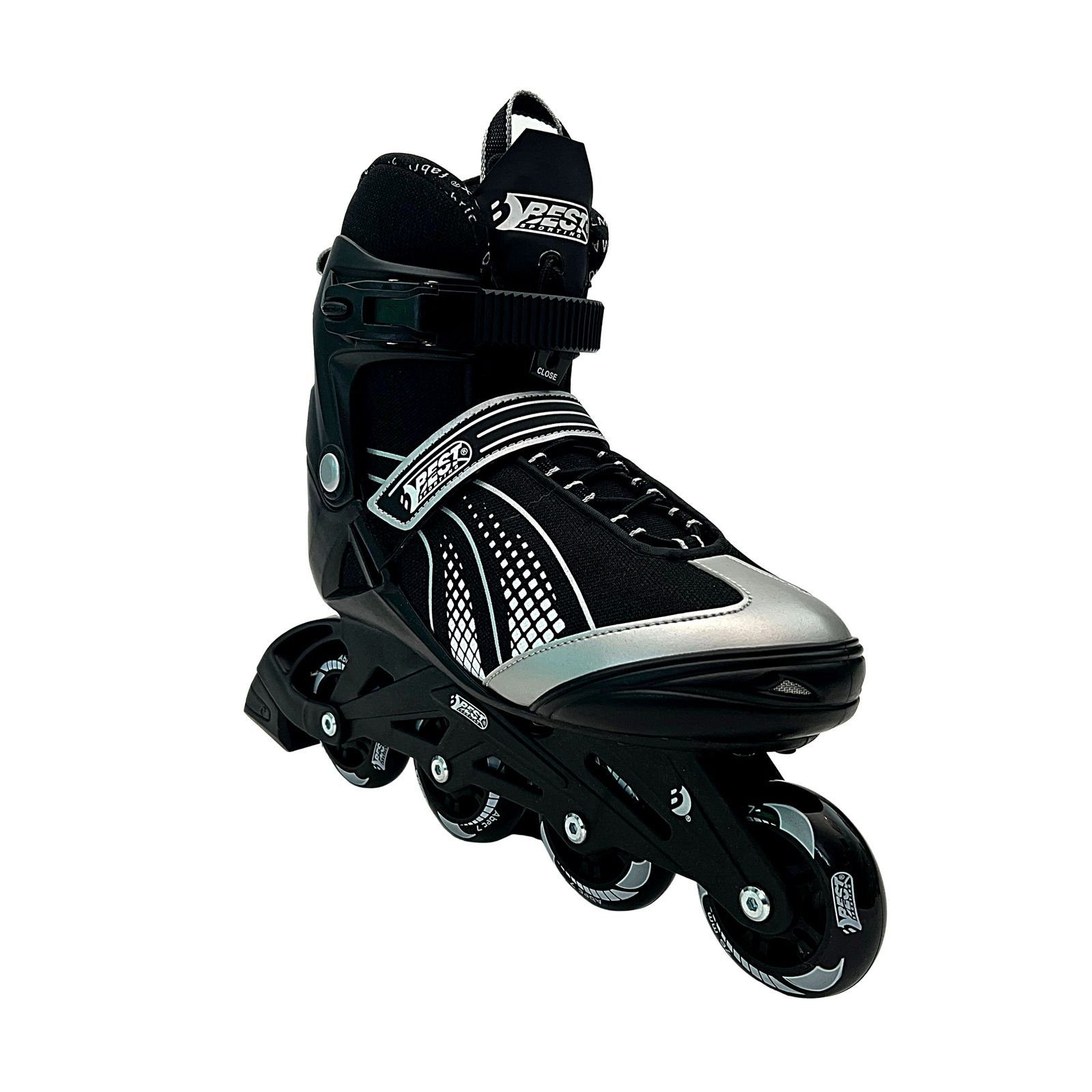 Die hochwertigen, atmungsaktiven Inline-Skates lassen sich mit einem Knopfdruck in vier Schuh-Größen anpassen. Dadurch sind die Inliner individuell verstellbar und lange nutzbar, da sie quasi mitwachsen. Das robuste Gestell aus verstärktem, schlagfesten Kunststoff und Semi Softboots bietet einen sehr hohen Tragekomfort und sicheren Halt für den Fuß. 3-Fach Sicherheit: Verstellbare Verschluss-Schnalle mit 1-Hand-Mechanik, Powerstrap mit Klettverschluss und Quick Lace Schnellschnürsystem sorgen für leichten Einstieg und einen hervorragenden Halt. Einstieg und Ausstieg werden enorm erleichtert durch die beiden Schlaufen an Ferse und Schutzlasche. Das atmungsaktive Innenfutter ist mit farbigem Stoff ausgekleidet und hat eine Polsterung aus hochwertigem Memory-Foam. Dies garantiert einen unvergleichlich bequemen Sitz der Inline Skates am Fuß! Das feste und dennoch flexible Außengewebe gibt dem Fuß Schutz und Halt zugleich, während es atmungsaktiv und schnell trocknend ist.
