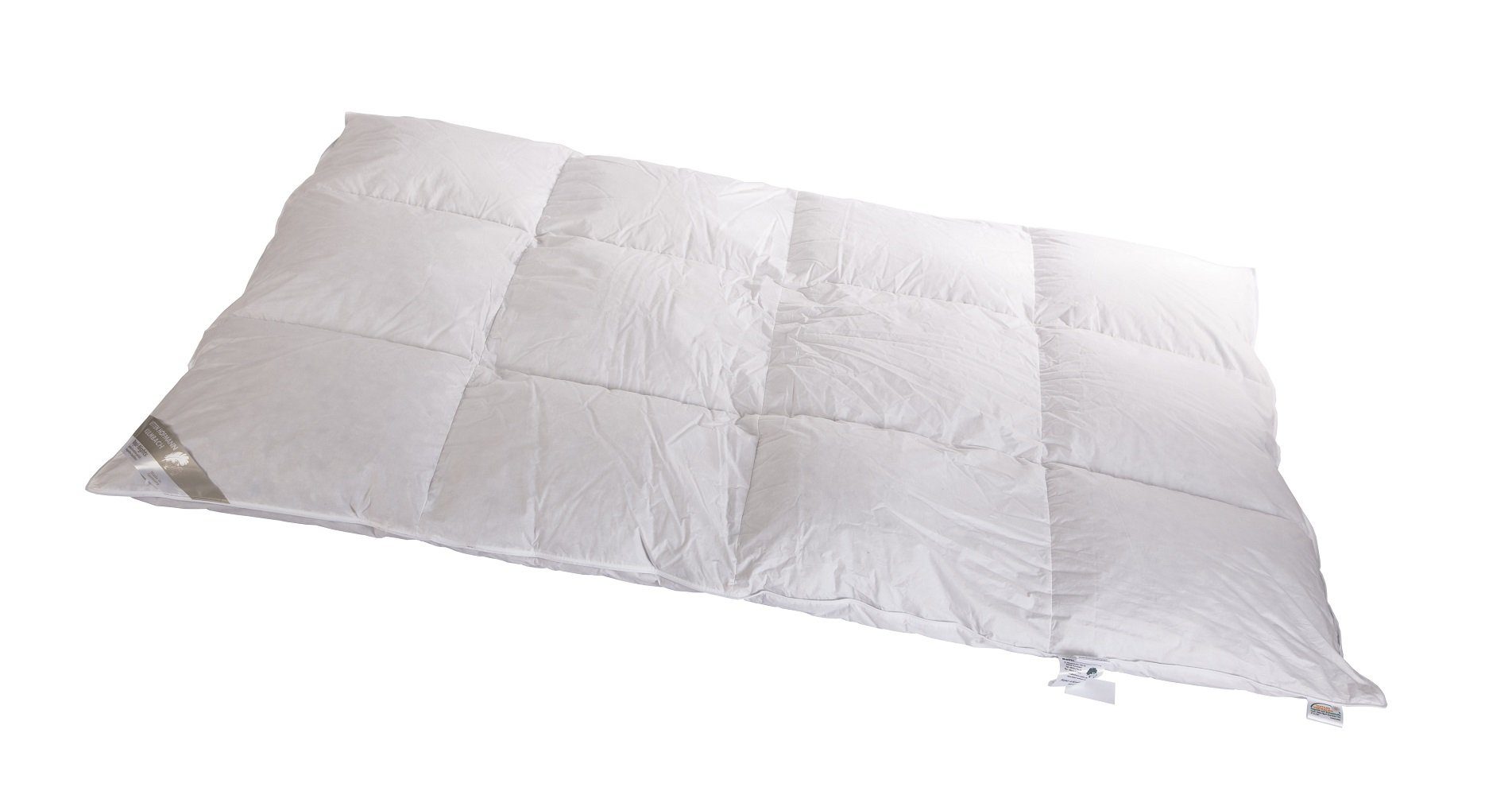 Hofmanns exklusiv SIBIRIA Winterdecke Daunen-Kassetten-Bett 3x4 155/200 cm. Super warme Winter-Bettdecke. Für Jeden mit besonders hohen Wärmebedürfnis. Natur pur: Daunen, Baumwolle und sonst nichts! Fixierte Füllung - ohne jegliche Kältezonen, Füllung: 1020 Gramm neuer grauer sibirischer Wildgänseflaum Klasse 1A1A (100% Wild-Gänsedaunen), Bezug: feinste deutsche Mako-Einschütte NM 100, 100% Baumwolle superfein, Innensteghöhe 3 cm, Farbe: weiß mit Biese, Wärmegrad 5. Wasch- und Pflegehinweise: Waschbar bis 60°C, trocknergeeignet. Gütesiegel und Kennzeichnungen: für Hausstauballergiker geeignet, kein Lebendrupf, eigene Anfertigung. Wir machen Ihnen die Entscheidung leicht. Daunenbetten mit 100% Daunenfüllung sind die qualitativ hochwertigeren und daher auch kostspieligeren Betten. Hierbei können Sie mit Sicherheit nur die richtige Entscheidung treffen, das wird Ihnen jeder Fachhändler bestätigen. Die Lebenserwartung einer Feder liegt zwischen 5-10 Jahren. Bei einer Daune liegt sie zwischen 20-30 Jahren. Das liegt daran, dass eine Feder brechen kann und somit schneller verschlissen ist als eine Daune. Ein einfacher Händler kann Ihnen nicht sagen was wirklich in Ihren Betten ist. Er muss sich darauf verlassen, was auf dem Bett geschrieben ist. Wir dagegen können Ihnen zeigen, welche Daunen und Federn in Ihren Betten gefüllt werden. Gerne können Sie auch dabei sein, wenn Ihre Betten bei uns angefertigt werden. Все unsere Daunen- und Feder Produkte werden in unserem Hause nach Auftragseingang selbst gefüllt und direkt an Sie ausgeliefert. Sie erhalten also immer frisch angefertigte Ware. Mehr Sicherheit kann Ihnen niemand geben! 10328