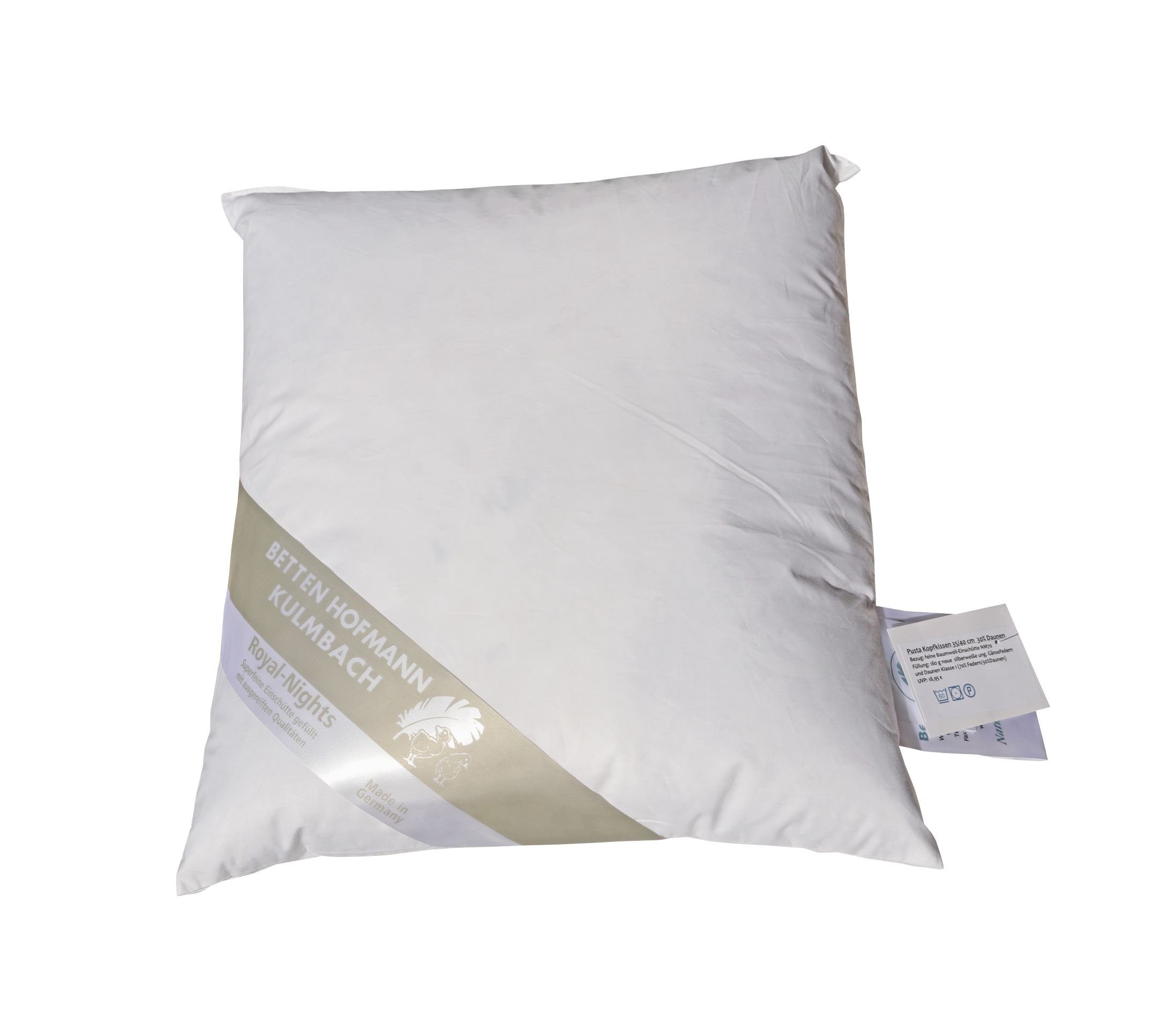 Hofmanns Kopfkissen Kuschelkissen, 35/40 cm, weich und strapazierfähig. Bezug: Feine Soft-Baumwoll-Einschütte NM 70, 100% Baumwolle. Füllung: 180g neue silberweiße ung. Federn und Daunen, Klasse 1, 70% Federn - 30% Daunen, Farbe: weiß. Wasch- und Pflegehinweise: Waschbar bis 60°C, trocknergeeignet. Gütesiegel und Kennzeichnungen: für Hausstauballergiker geeignet, kein Lebendrupf, eigene Anfertigung.