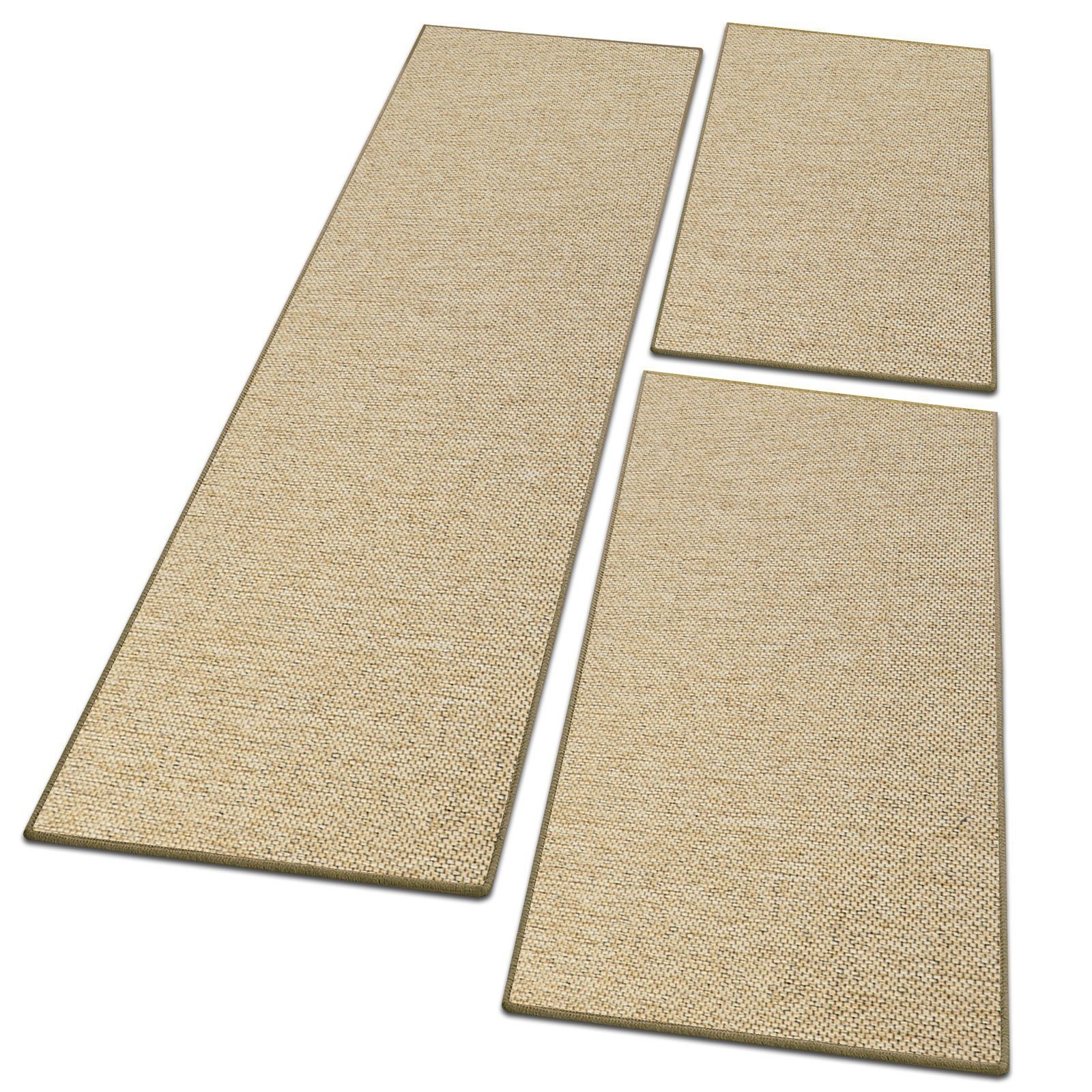 Mit der Bettumrandung in Sisal-Optik „Sabang“ holen Sie sich ein besonders elegantes Läufer-Set ins Schlafzimmer. Bestehend aus drei Teilen – zwei kurzen Teppichbrücken für die beiden Seiten und einem langen Läufer für die Stirnseite des Bettes – erhält Ihr Bett eine attraktive und wohnliche Umrandung in natürlicher Sisal-Optik.