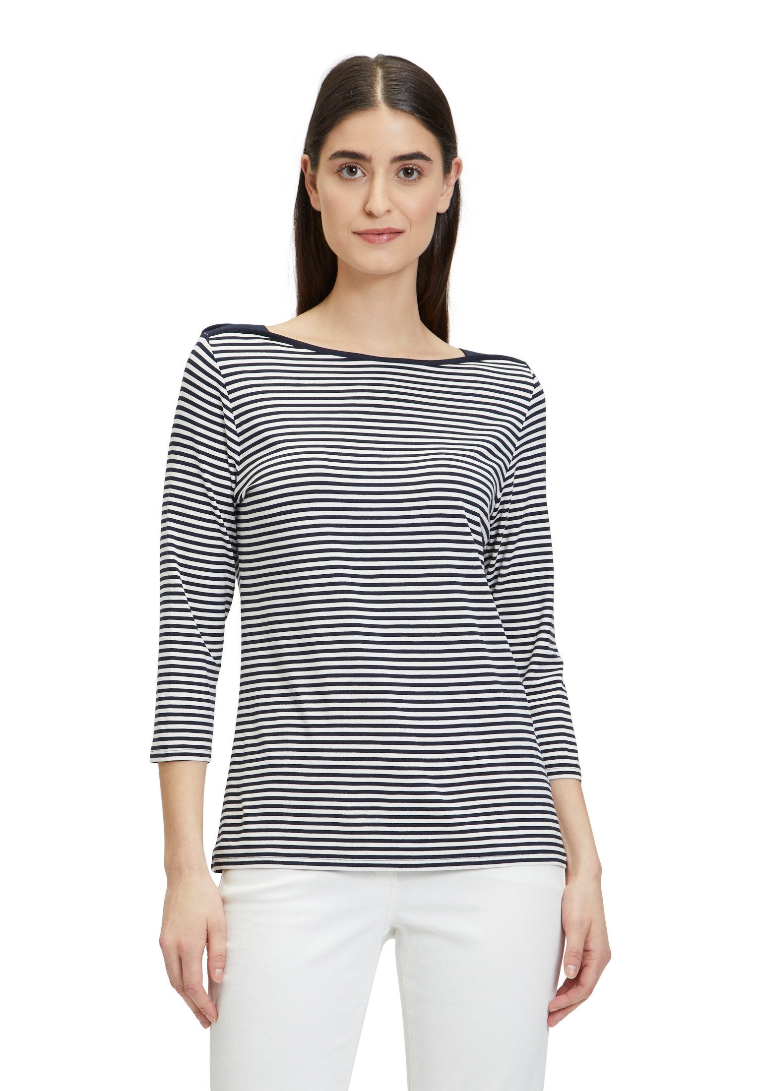 Entdecken Sie Ihr neues Lieblingsstück von Betty Barclay! Das Ringelshirt mit Blende aus leichtem Jersey ist leicht tailliert und verleiht mit femininem U-Boot-Ausschnitt und 3/4 Arm einen zeitlosen Charme. Perfekt für einen lässig-eleganten Look mit Streifenmuster.