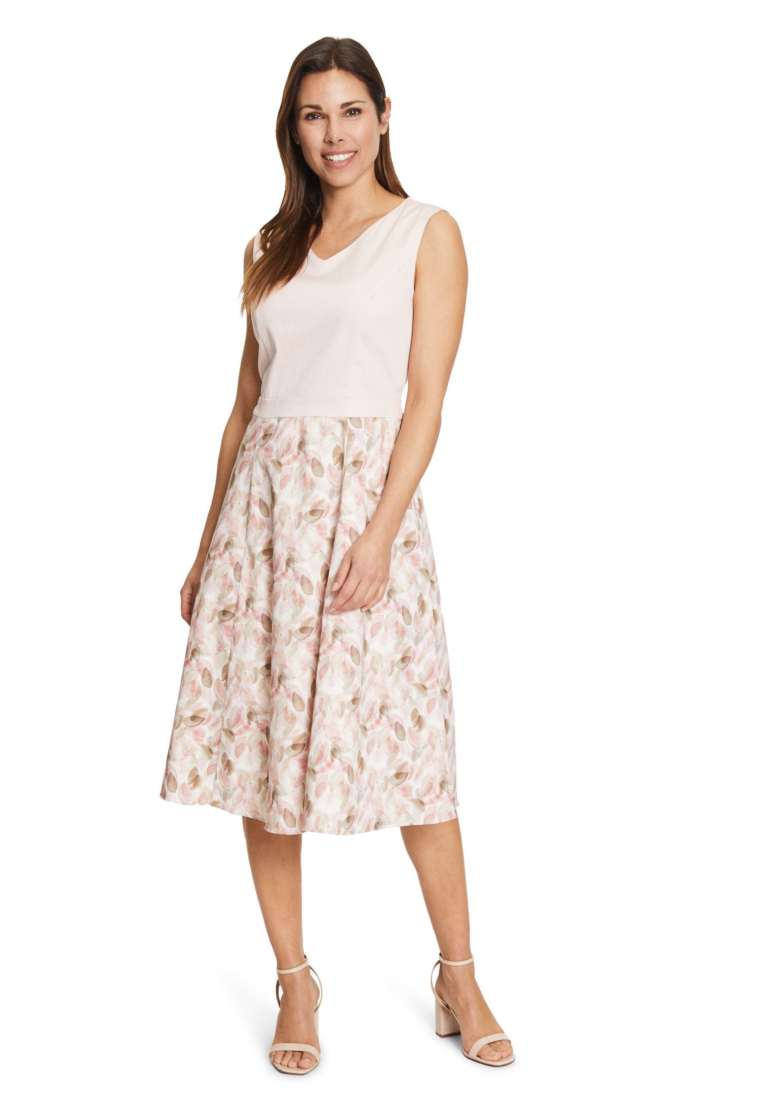 Dieses taillierte Midikleid in zartem Rose/Cream ist ein echter Blickfang für die warme Jahreszeit. Mit seinem femininen V-Ausschnitt, dem ärmellosen Design und dem gemusterten Stoff bringt es Leichtigkeit und Stil in deinen Sommerlook. Der hochwertige Baumwoll-Elasthan-Mix sorgt für angenehmen Tragekomfort, während das Viskosefutter ein weiches Hautgefühl garantiert. Ideal für Gartenpartys, Sommerfeste oder einen eleganten Stadtbummel. Highlights: -Sommerliches Design in zartem Rose/Cream mit stilvollem Muster -Taillierter Schnitt für eine feminine Silhouette -Leichtes, atmungsaktives Material mit Stretch-Anteil für optimalen Komfort -V-Ausschnitt & Midi-Длина – schmeichelhaft und elegant -Reißverschluss hinten für einfaches An- und Ausziehen -Futter aus 100 % Viskose – weich und hautfreundlich -Pflegeleicht – maschinenwaschbar bei 30°C