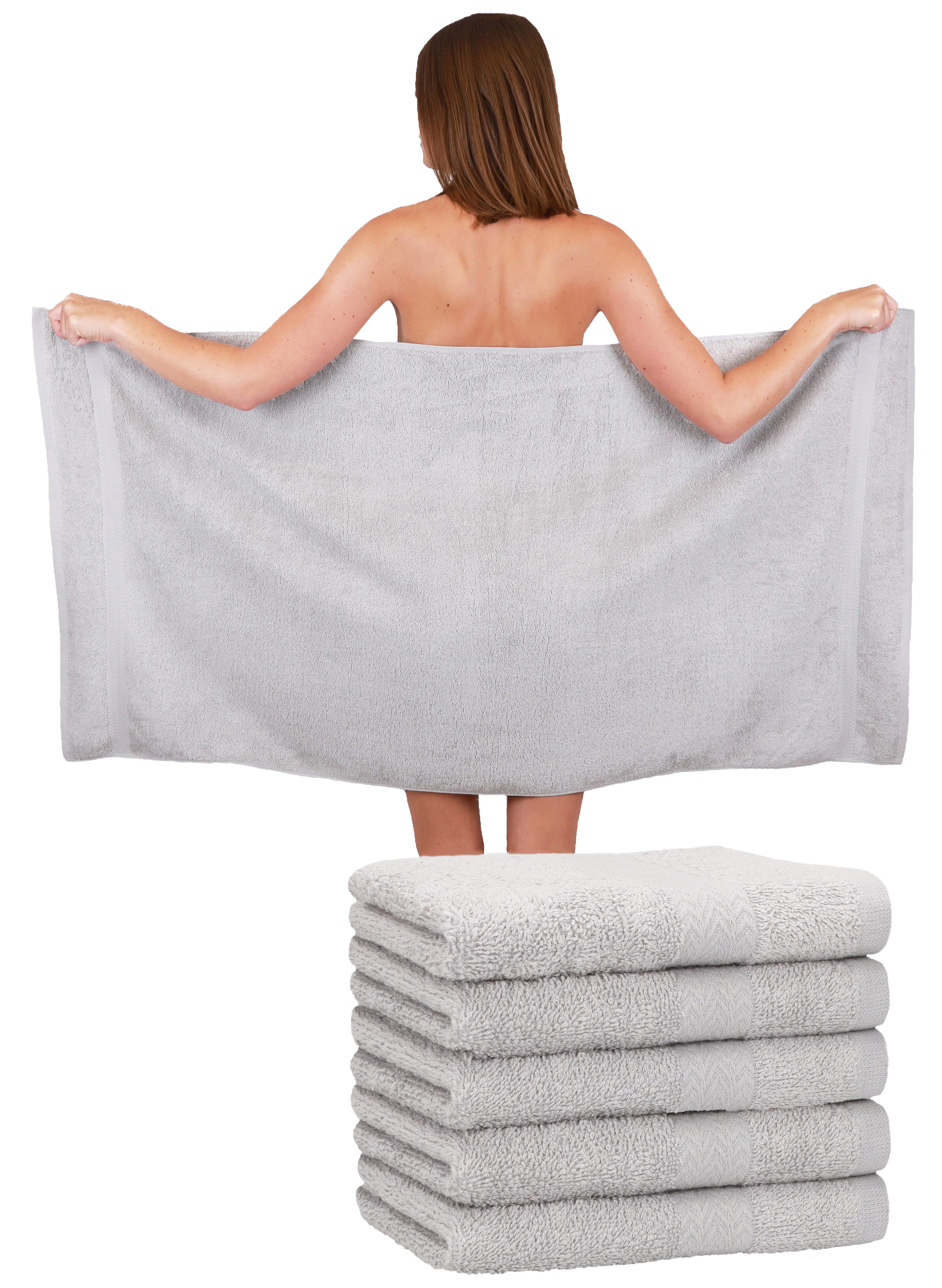 Betz 6 Stück Duschtücher PREMIUM Размер 70 cm x 140 cm 100% Baumwolle Duschtuch-Set Farbe Silber Das Duschhandtuch Badehandtuch Размер 70x140 cm bietet besten Wohlfühl Komfort durch seine besondere schwere Frottier Qualität Das Duschtuch Saunatuch Handtuch hat eine doppelte Bordüre und einen Handtuchaufhänger - Qualität 470 g/m² Die Walk Duschtücher Badetücher sind aus 100% Baumwolle - saugstark und strapazierfähig: 60°C waschbar und trocknergeeignet Die Serie Premium gibt es in vielen BASIC Farben und Größen sowie auch Badvorleger Verkaufseinheit: 6 Stück Duschtücher Frottee Größe: 70x140 cm Farbe Silber