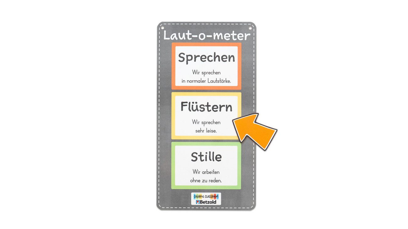 Lieferumfang | 1 Laut-o-Meter-Schild, magnetisch und mit Ösen (B x H: 20 x 38 cm) 1 Pfeil, magnetisch und mit Ösen (B x H: 9 x 7 cm) |